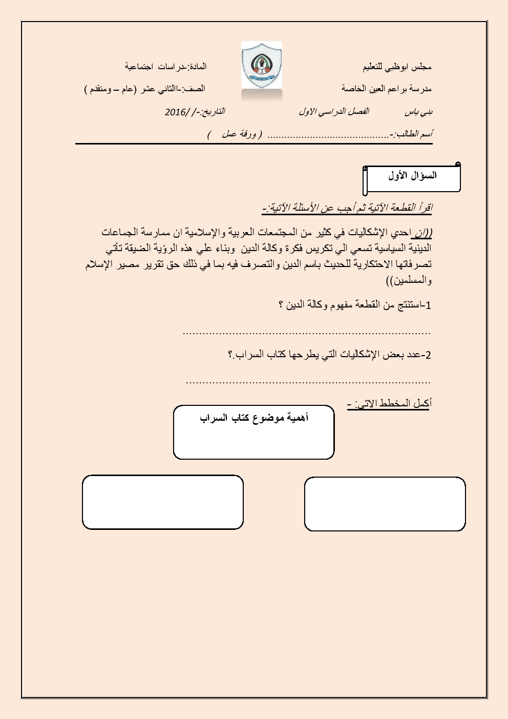 الصف الثاني عشر, الفصل الأول, اجتماعيات- أوراق عمل 2016-2017