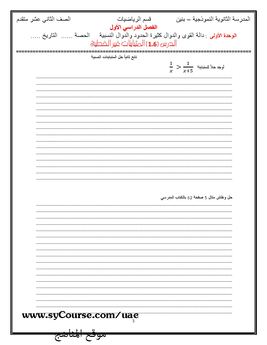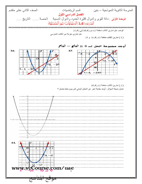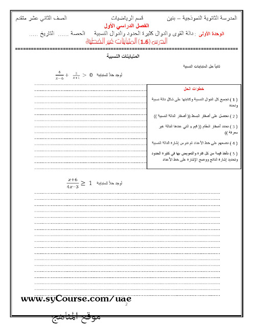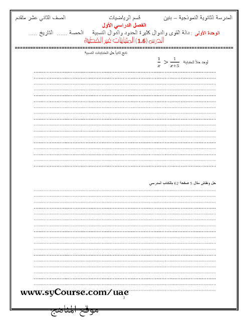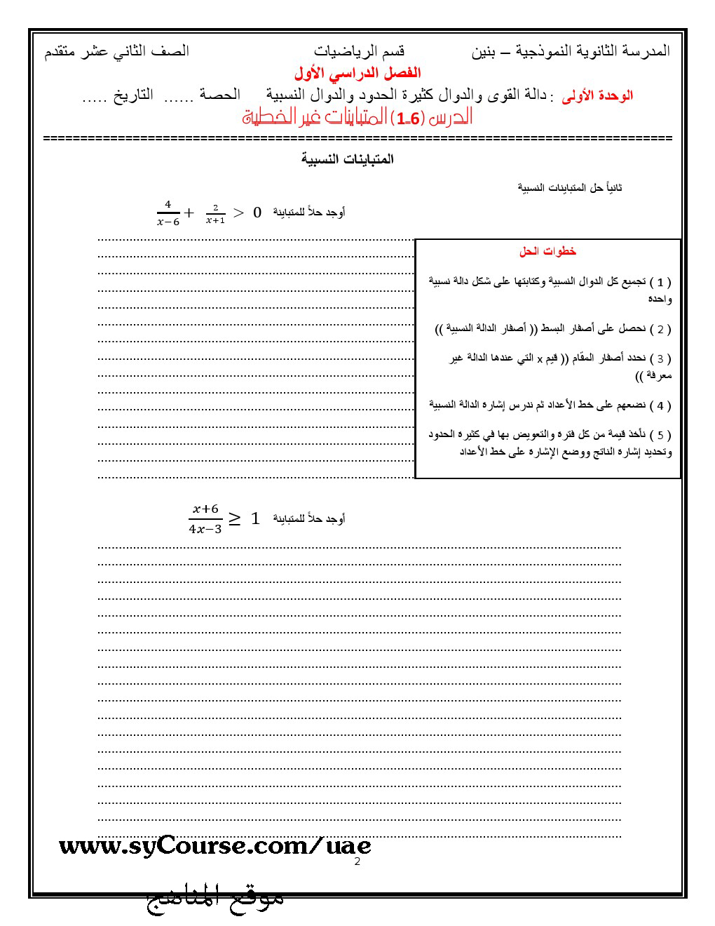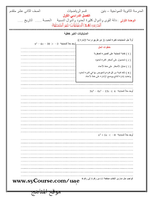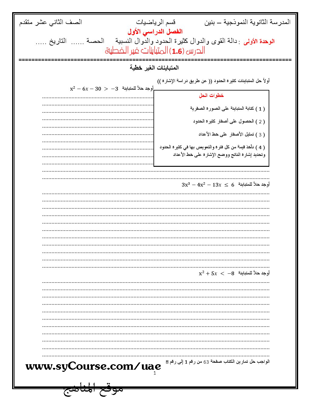 معلومات الملف: الصف الثاني عشر المتقدم, الفصل الاول, رياضيات, الوحدة الأولى- المتباينات غير الخطية 2016-2017 | ||