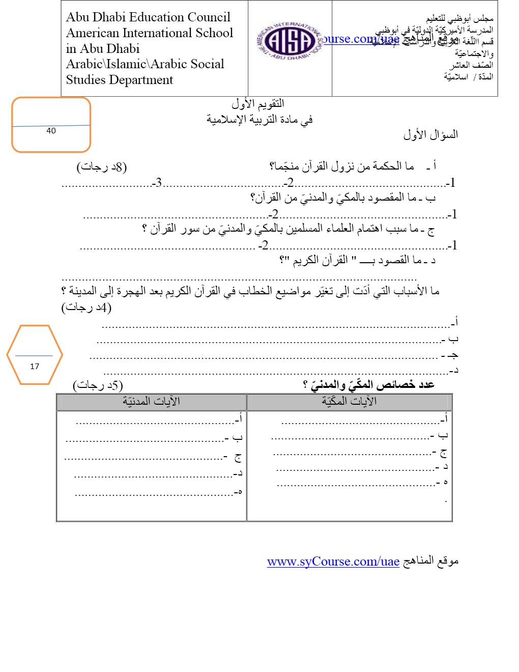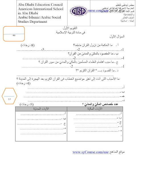 معلومات الملف: الصف العاشر,الفصل الأول, تربية اسلامية, - التقويم الأول 2016-2017 ويمكن للطلبة التدرب على هذا النموذج للتحضير للاختبار التكويني | ||