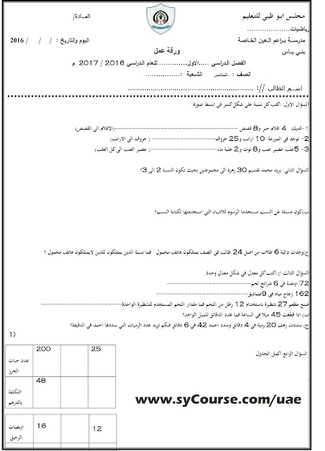 الصف السادس, الفصل الأول, رياضيات,-ورقة عمل النسب 2016-2017