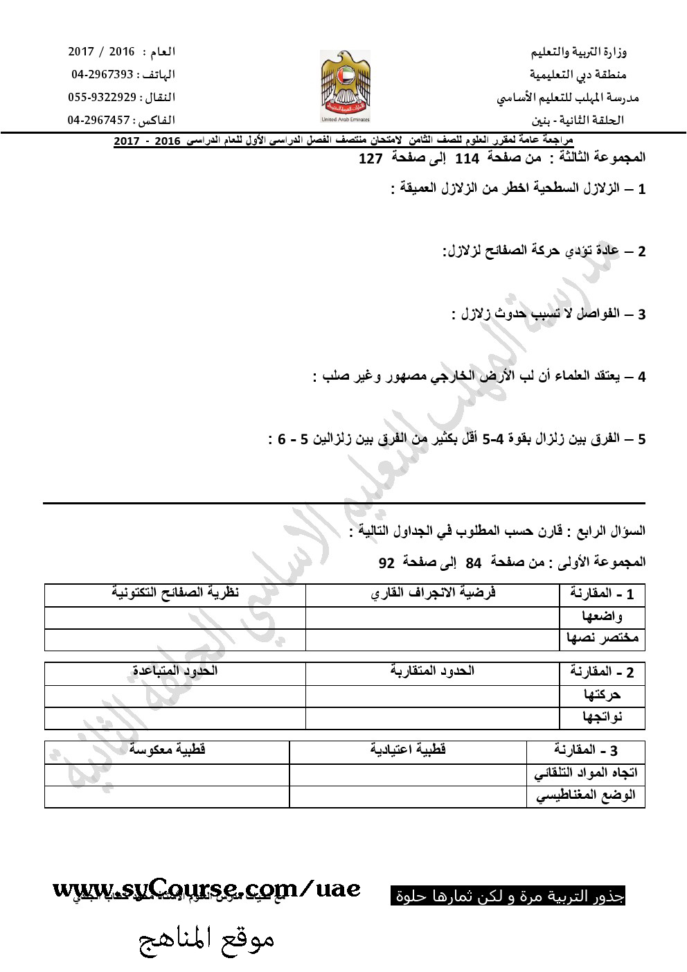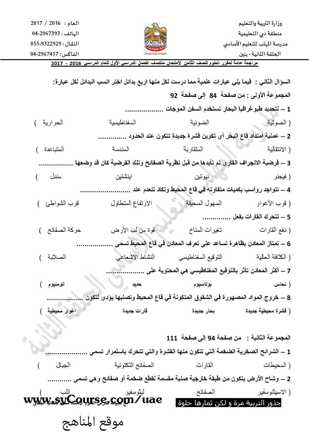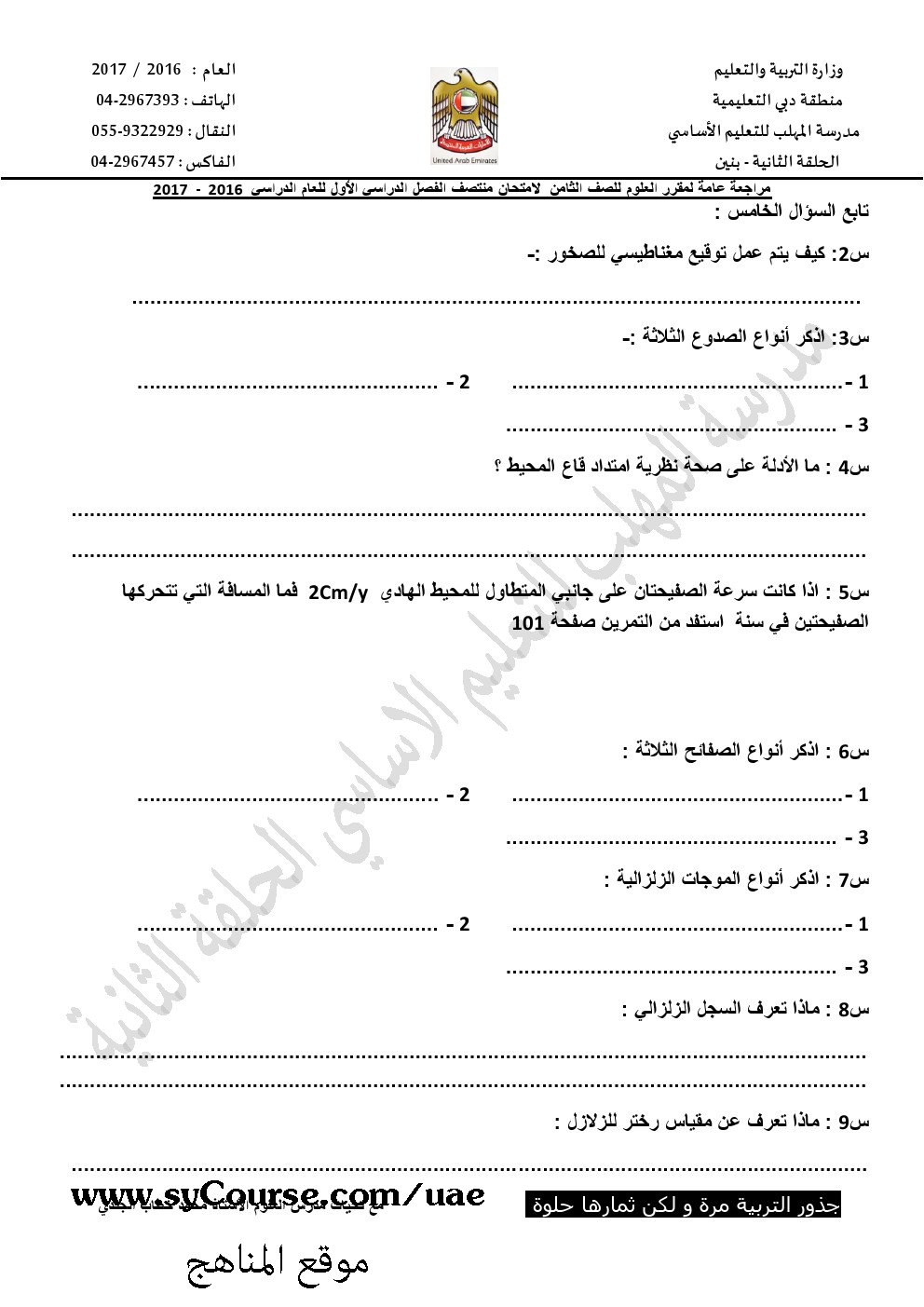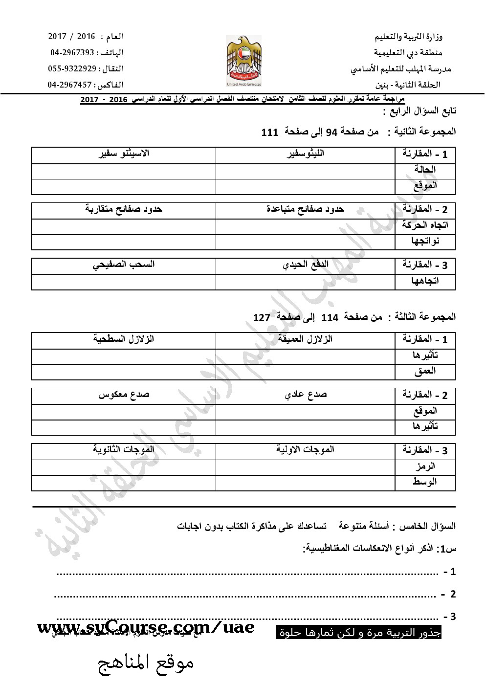 معلومات الملف: الصف الثامن, الفصل الأول, علوم, مراجعة قبل الامتحان 2016-2017 | ||