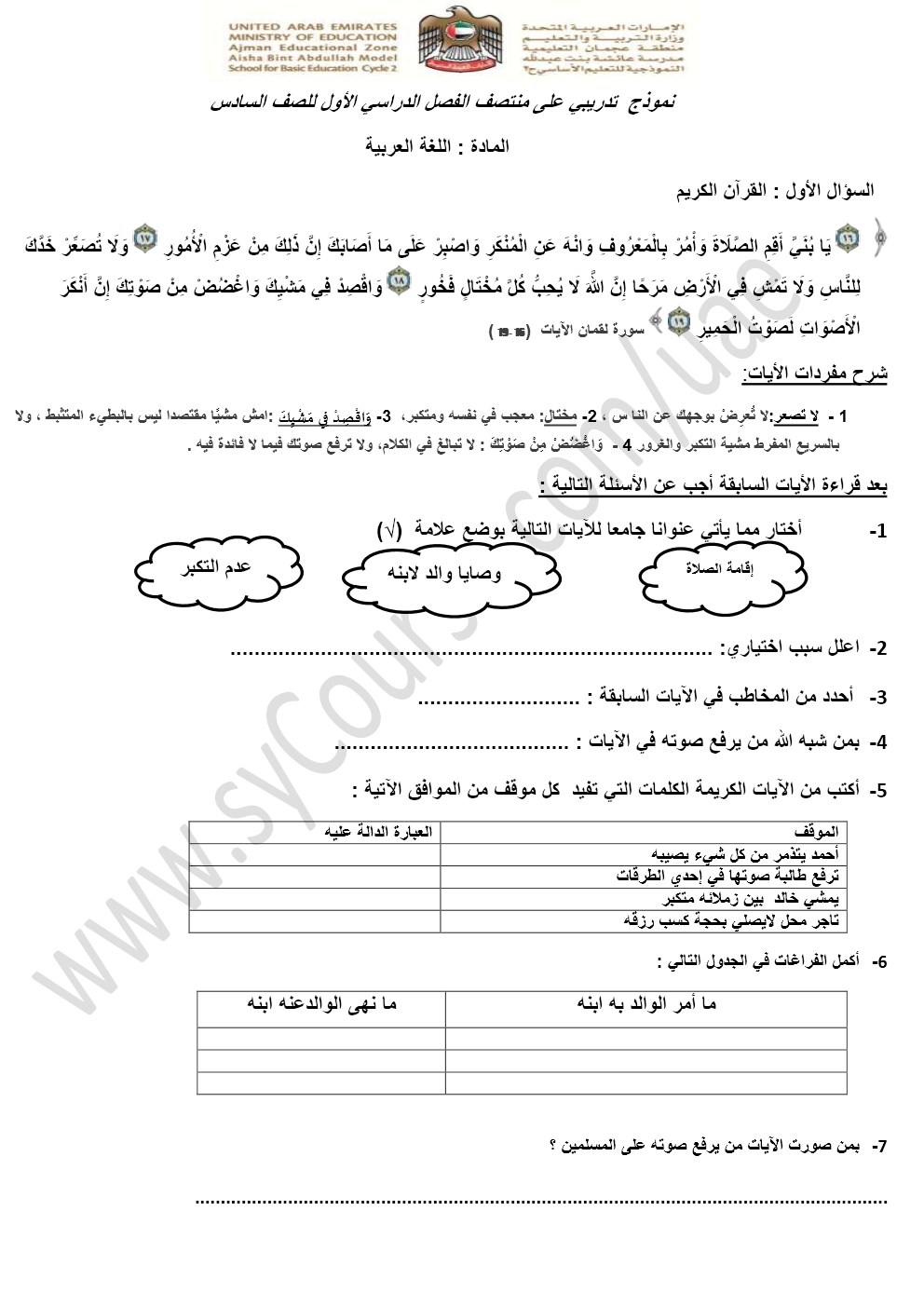 الصف السادس- الفصل الأول- لغة عربية- نموذج امتحاني 2016-2017 |