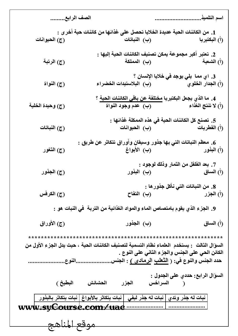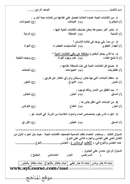 الصف الرابع, الفصل الأول, علوم, نموذج امتحاني 2016-2017 |
