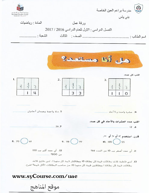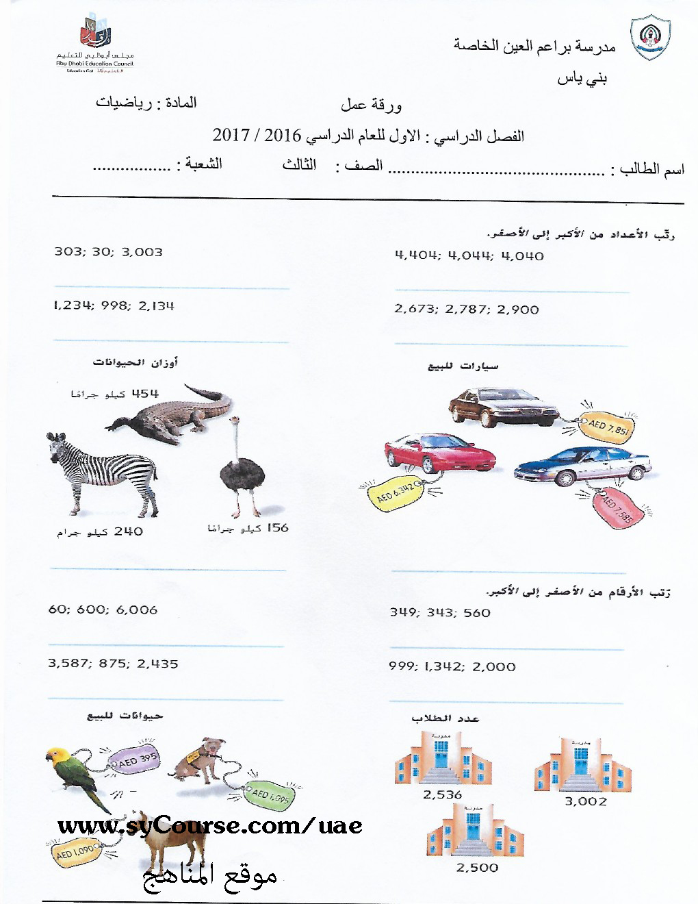 الصف الثالث, الفصل الأول, رياضيات, أوراق عمل 2016-2017 | ||