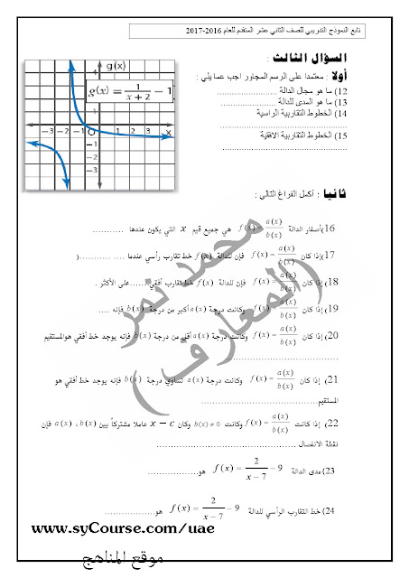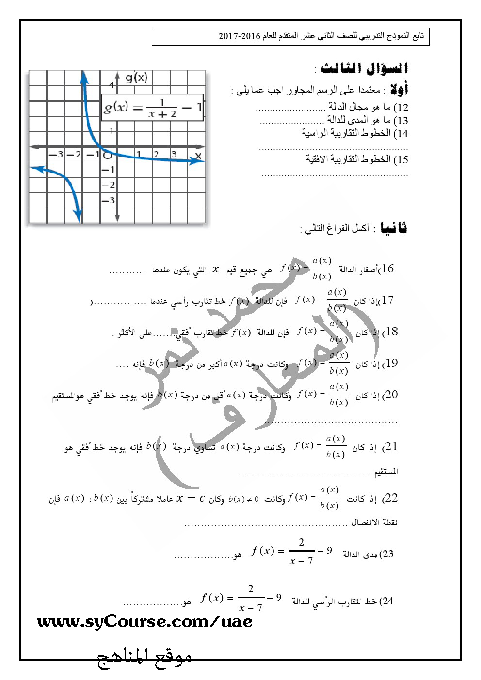 الصف الثاني عشر متقدم, الفصل الأول, رياضيات, مراجعة قبل الامتحان 2016-2017 | ||