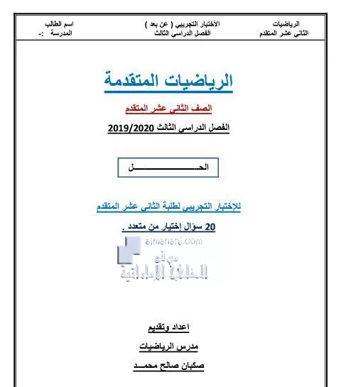 معلومات الملف: نرفق لكم ملف يتضمن اختبار تجريبي للفصل الثالث مكون من 20 سؤال مع الحل من مادة رياضيات للصف الثاني عشر المتقدم الفصل الدراسي الثالث للعام الدراسي 2019-2020 | ||