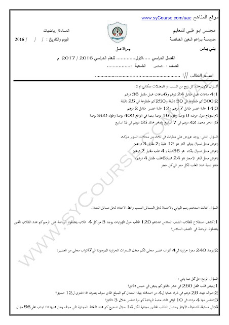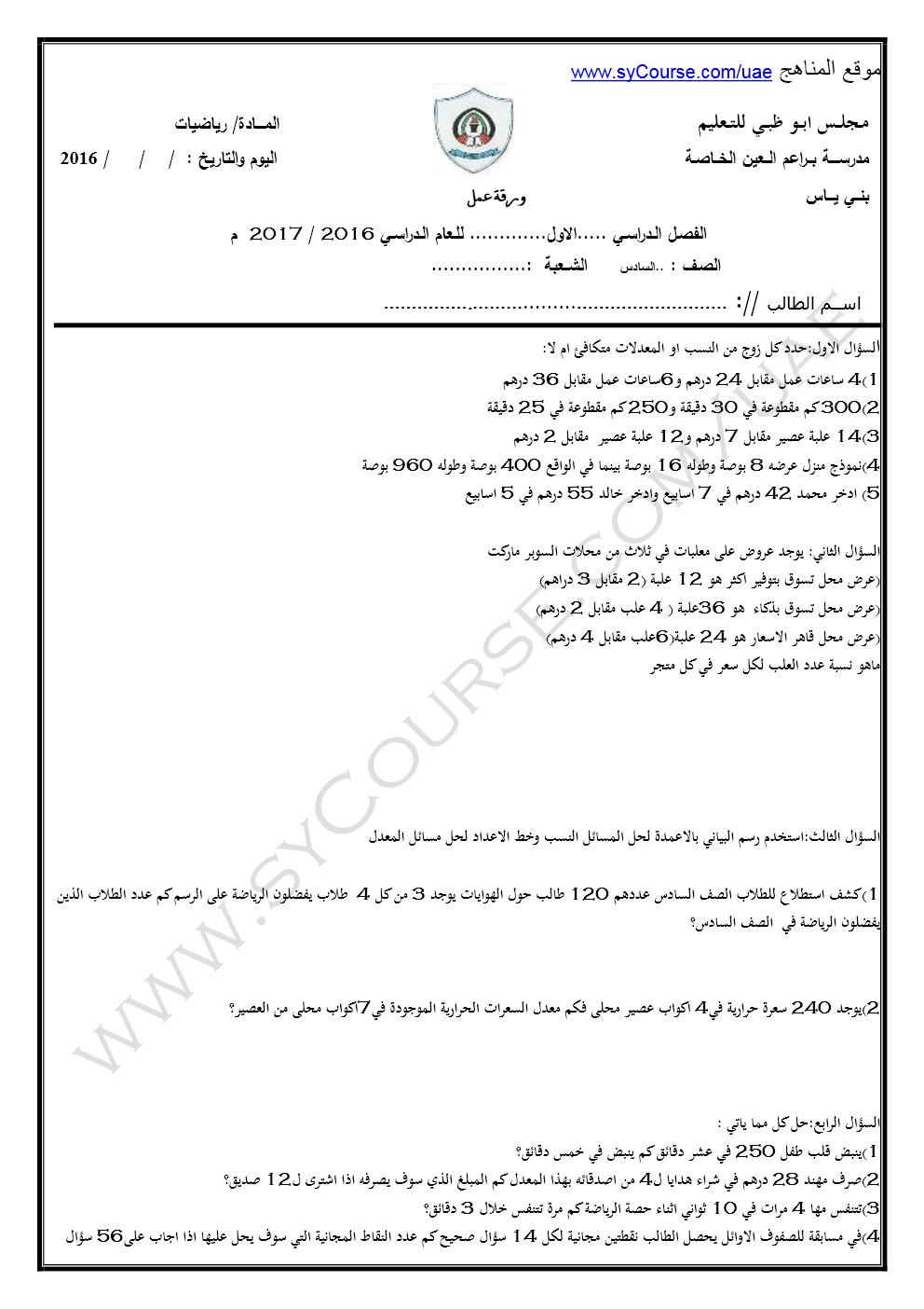 الصف السادس, الفصل الأول, رياضيات, مراجعة الوحدة الثانية 2016-2017