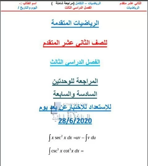 تم إيجاد الملف: مراجعة نهائية للوحدتين السادسة والسابعة التكامل بدون حل