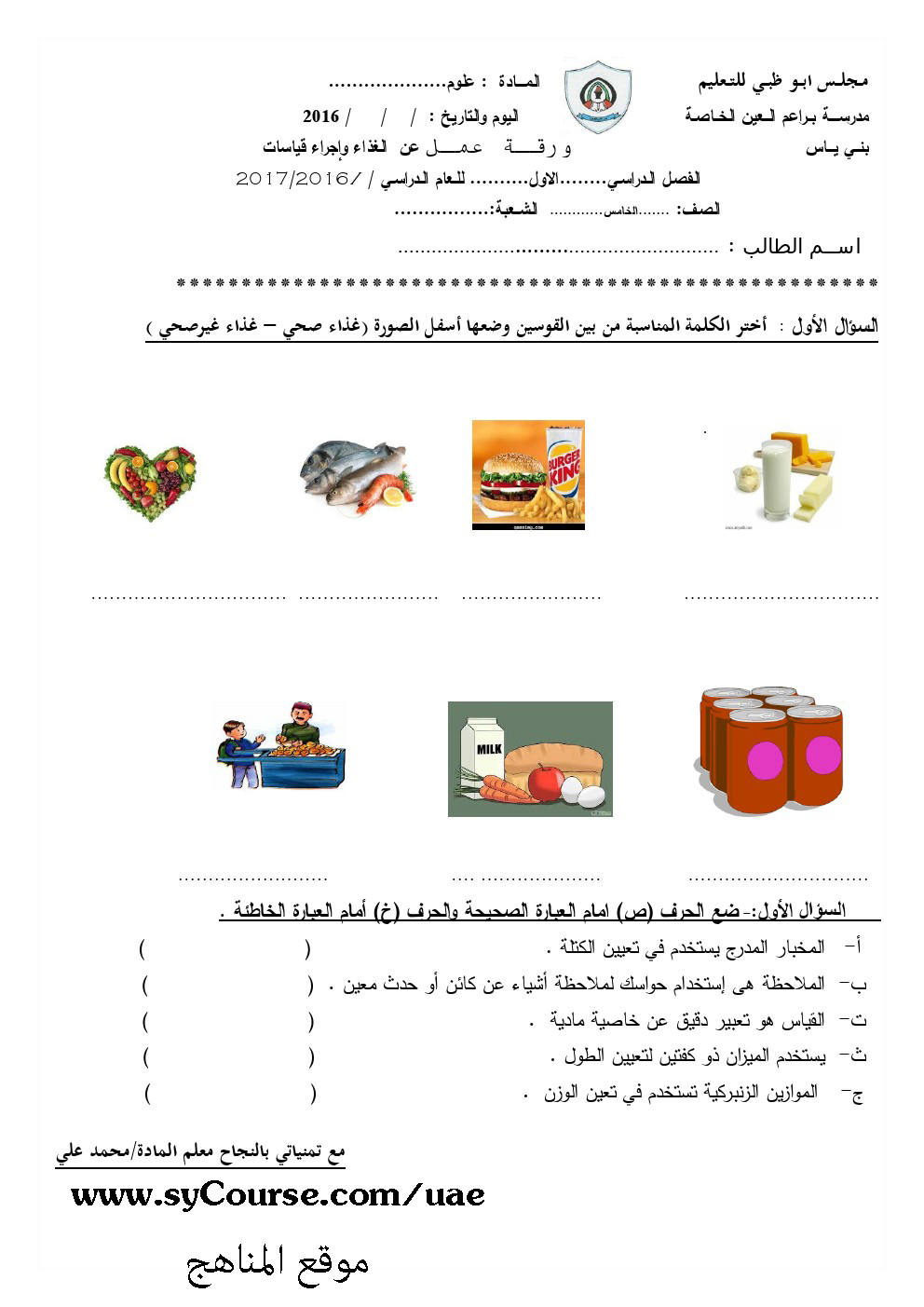 الصف الخامس, الفصل الأول, علوم, مراجعة على الغذاء 2016-2017 |