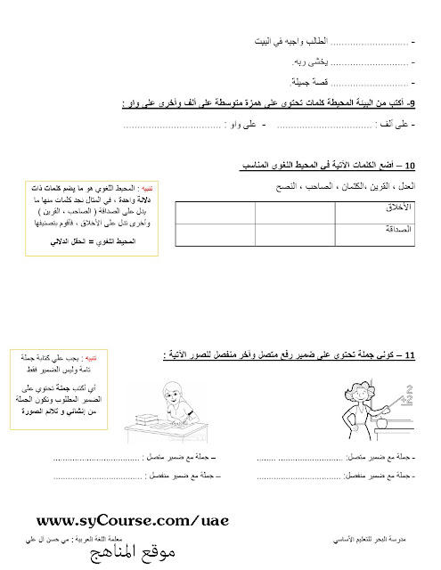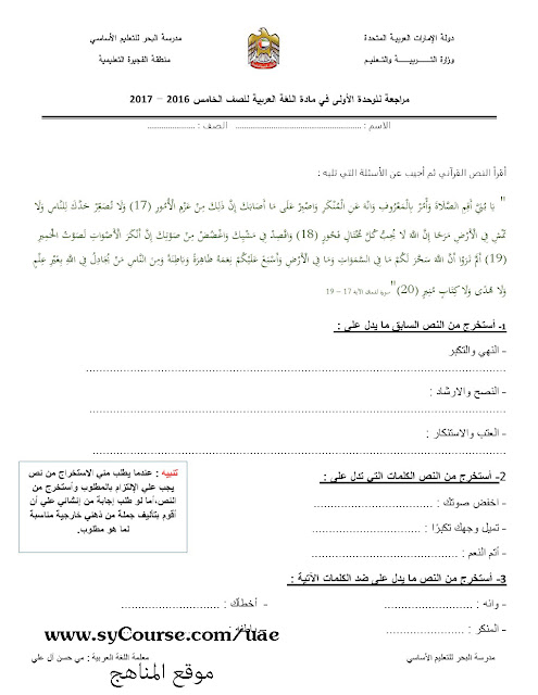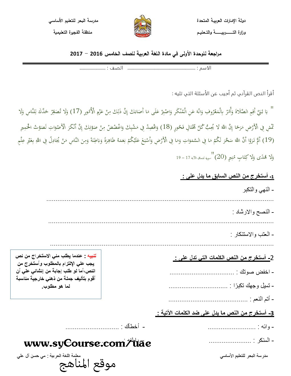 12. الصف الخامس, لغة عربية, مراجعات للدروس وفق الهيكل الوزاري الجديد