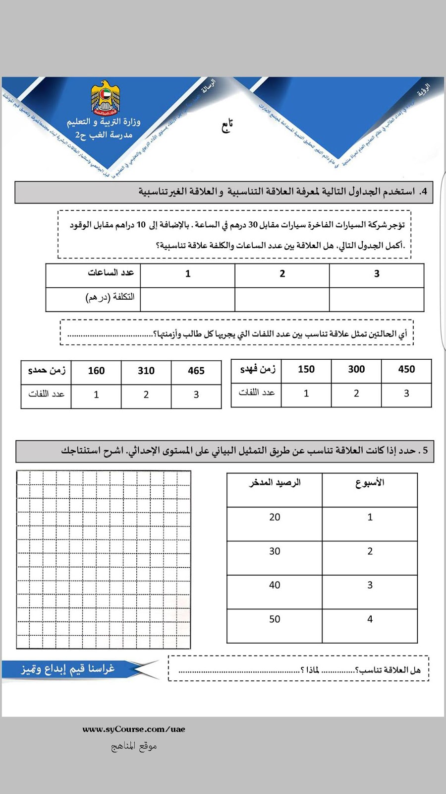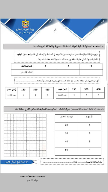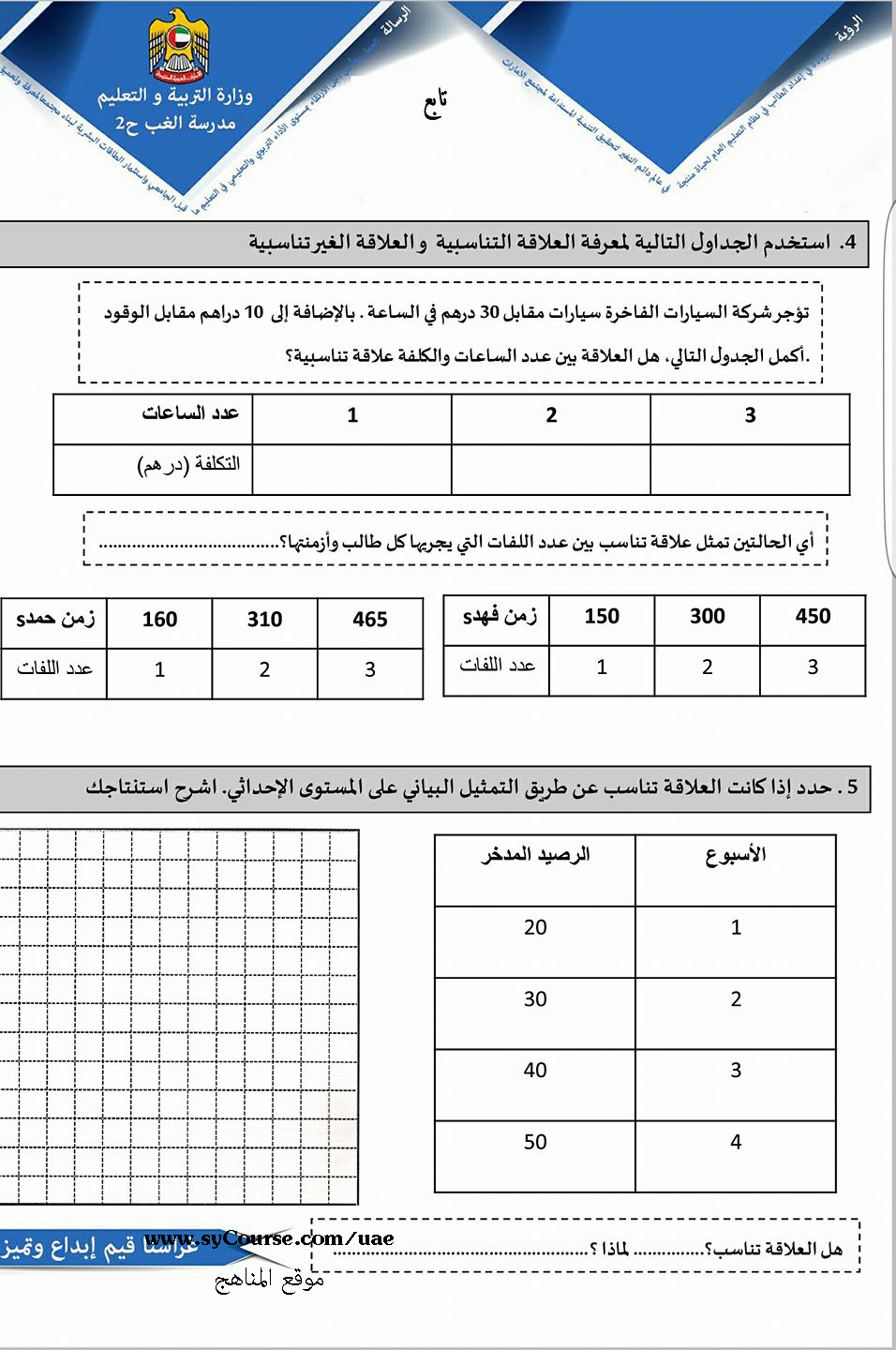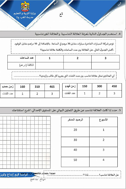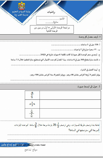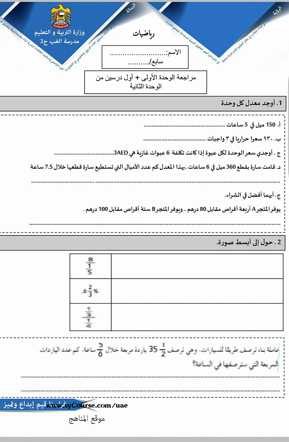 الصف السابع, الفصل الأول, رياضيات, اوراق عمل مراجعة الوحدة الأولى 2018-2017 للمنهاج الاماراتي الحديث: