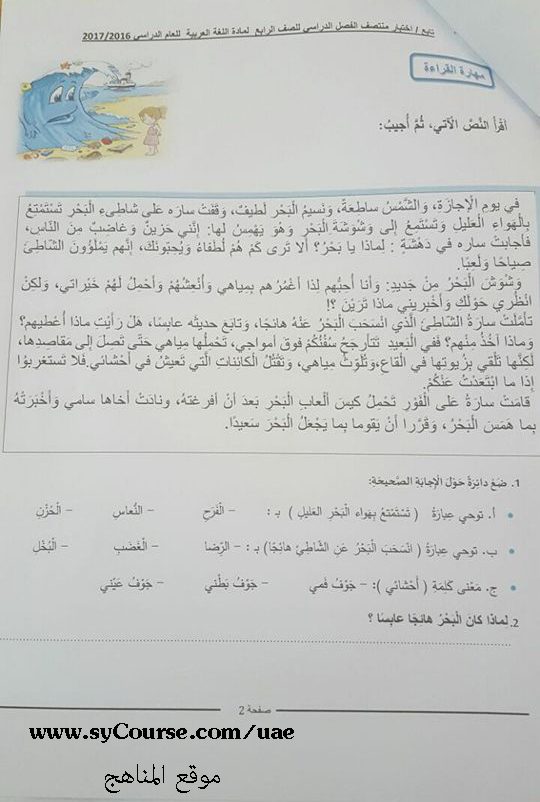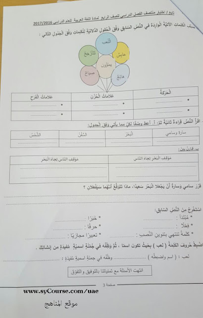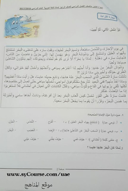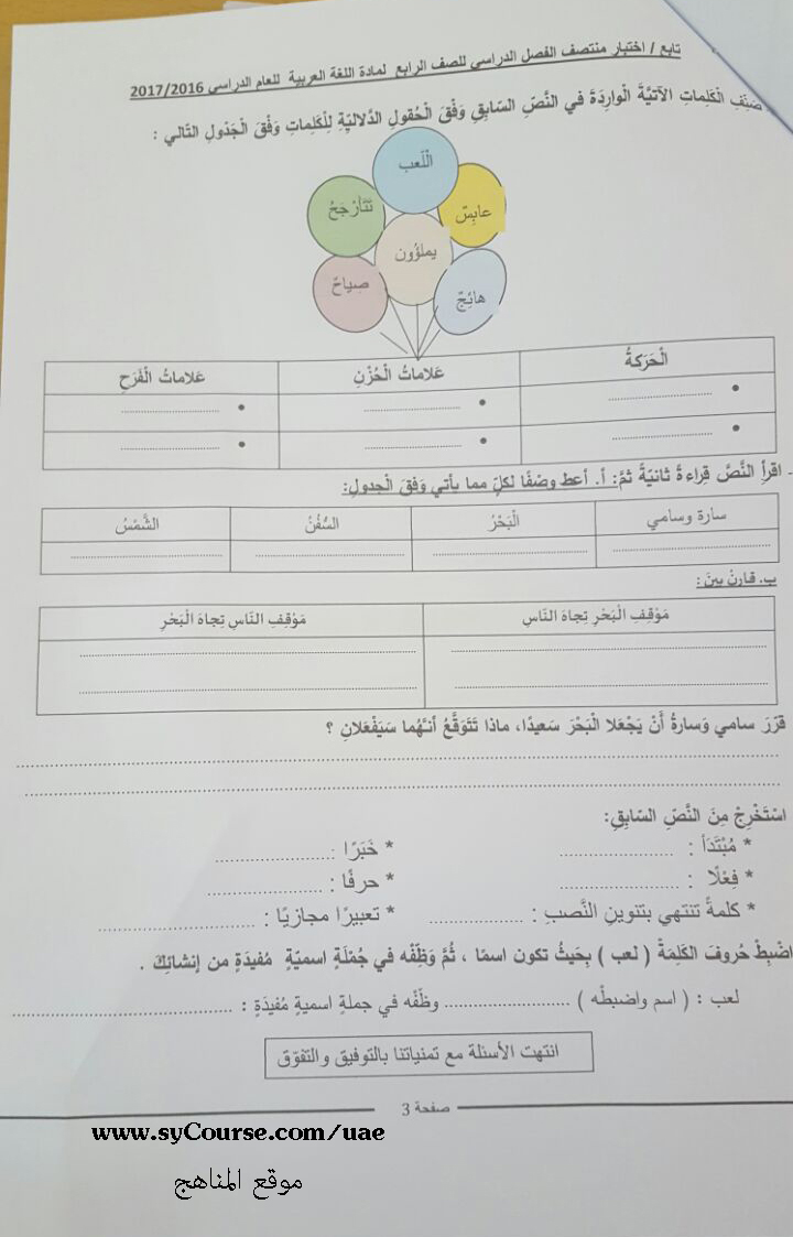 الصف الرابع, لغة عربية, الفصل الأول, الامتحان الوزاري 23-10-2016 للعام الدراسي 2016-2017 وفق المنهاج الاماراتي الحديث |