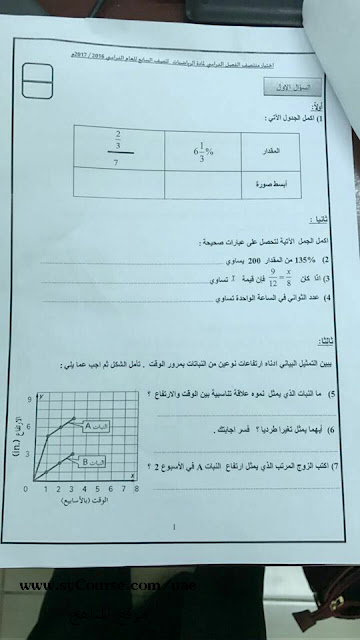 الصف السابع, الفصل الأول, رياضيات, الامتحان الوزاري 2016-2017 | ||