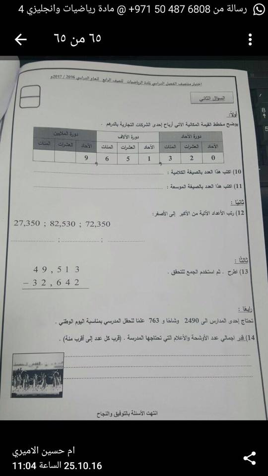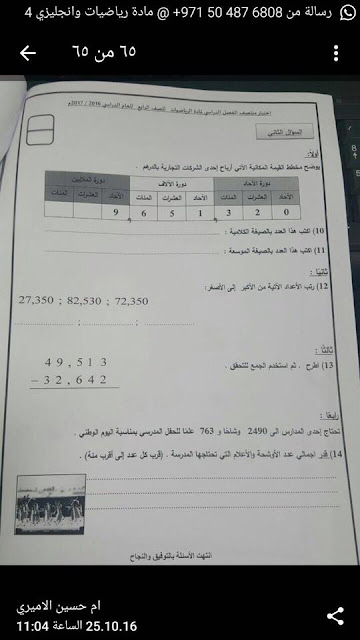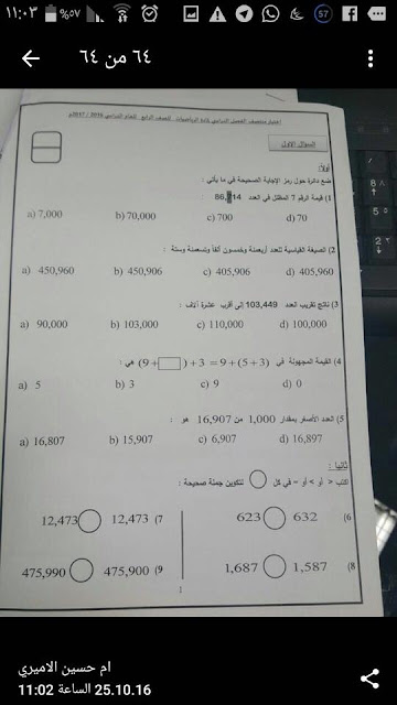 معلومات الملف: الصف الرابع, الفصل الأول, رياضيات, امتحان 25-10-2016 | ||