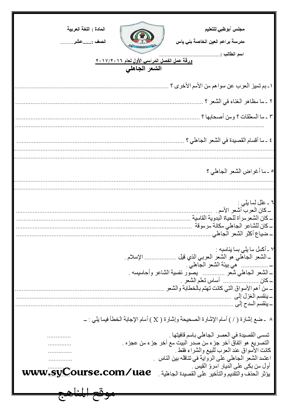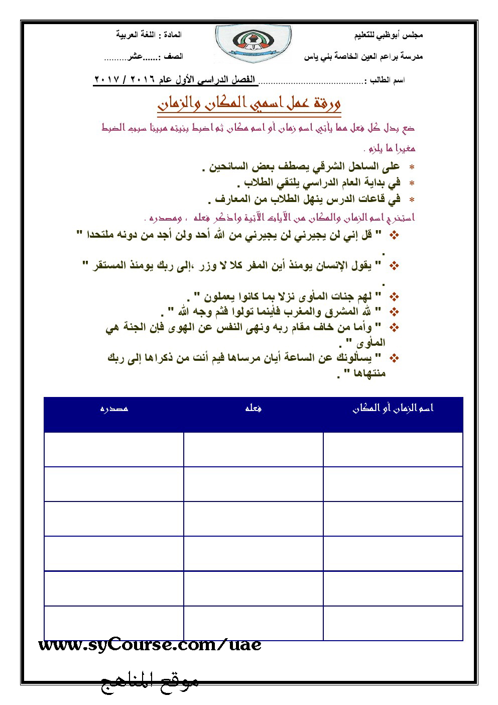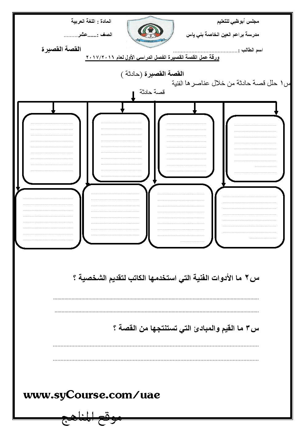 الصف الثاني عشر, الفصل الأول, لغة عربية, مذكرة العام الدراسي 2016-2017