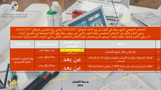 | فيما يلي تجدون الشروط الواجب توافرها في الطالب كي يتقدم الى الامتحانات التعويضية من 20 يونيو الى 24 يونيو 2021: 1- ان يكون قد تعرض لخلل تقني اثناء اجراء الامتحان. 2- في حال كان الطالب مصاب بفايروس كوفيد او كان مخالطا...مع الثبوتيات 3- في حال كان الطالب غير حاصل على نتيجة PCR .. حيث يجب ان تكون صالحة لمدة 96 ساعة. بالاضافة لتفاصيل اخرى متعلقة بكيفية تطبيق الامتحان التعويضي (عن بعد) و ضوابط فقرة السؤال. | ||