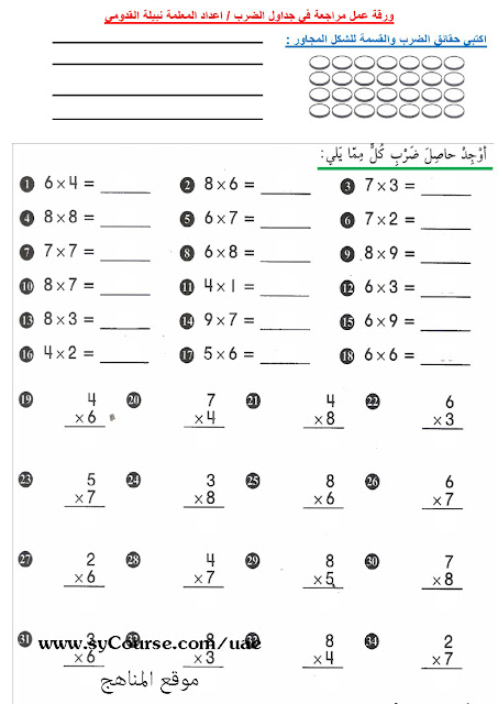 إليكم ورقة عمل في الرياضيات تعبر كمراجعة في جدول الضرب للصف الرابع وفق المنهاج الإماراتي الحديث للعام الدراسي 2016-2017