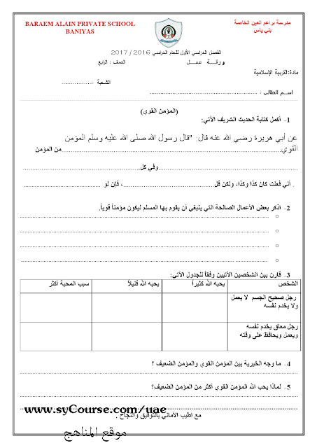 الصف الرابع, الفصل الأول, تربية اسلامية, أوراق عمل 2016-2017 وفق المنهاج الاماراتي الحديث