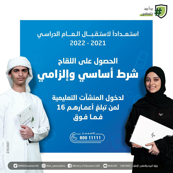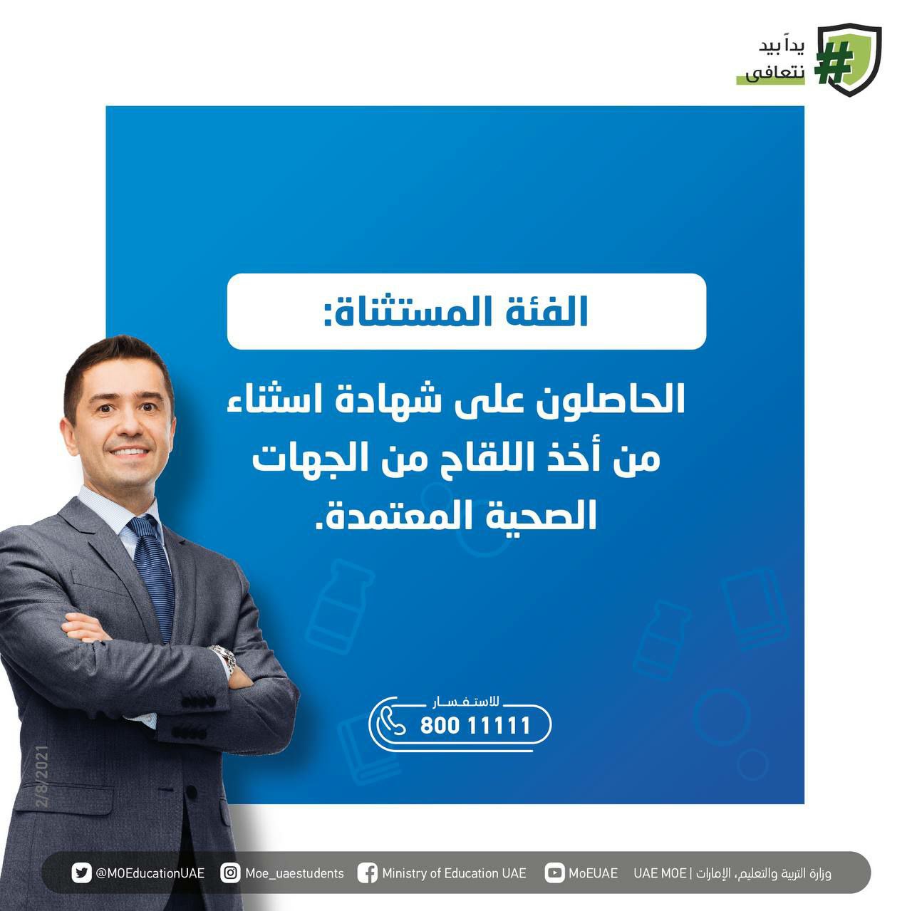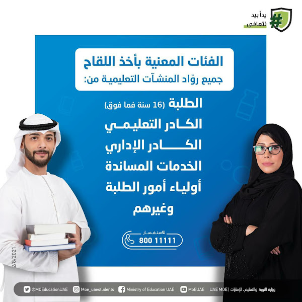 | تدعو وزارة التربية والتعليم جميع من هم أعمارهم 16 فما فوق إلى المسارعة في الحصول على اللقاح، فاللقاح شرط إلزامي لدخول جميع المنشآت التعليمية بما فيها الحضانات ومؤسسات التعليم العام الحكومية والخاصة ومؤسسات التعليم العالي الحكومية والخاصة ومعاهد ومراكز التدريب ومكاتب الخدمات الجامعية ومكاتب الاستشارات التعليمية | ||
