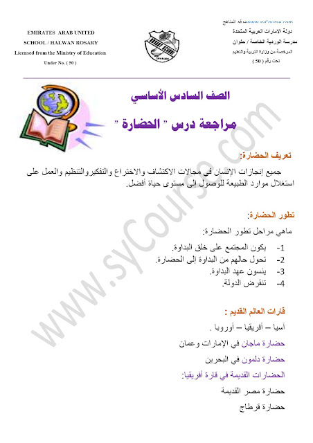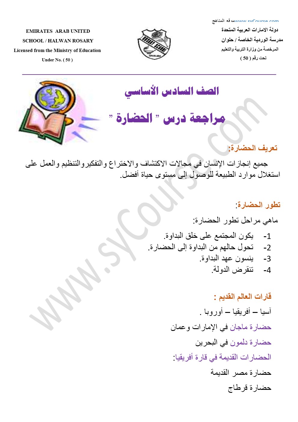 معلومات الملف: الصف السادس, الفصل الأول, اجتماعيات, مراجعة درس الحضارة تعريف الحضارةـ عوامل نشوء ـ سبب ازدهار | ||