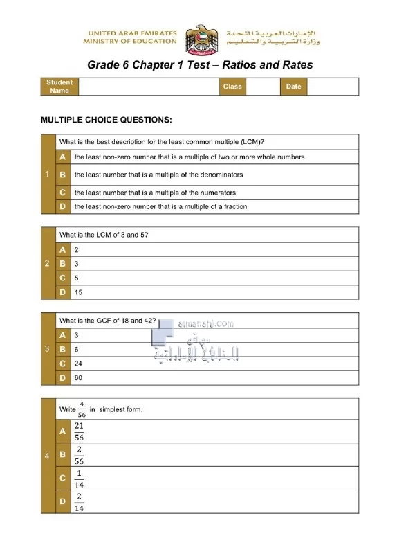 4. تدريبات كويز الوحدة الأولى Ratios and rates منهج ريفيل متبوعة بالإجابات