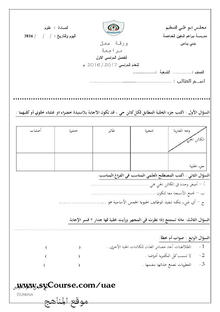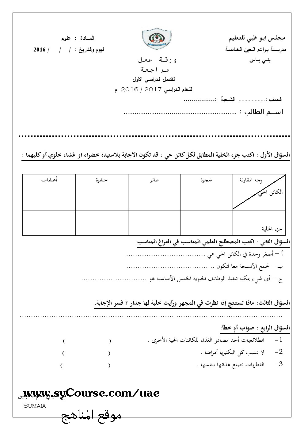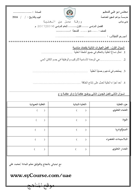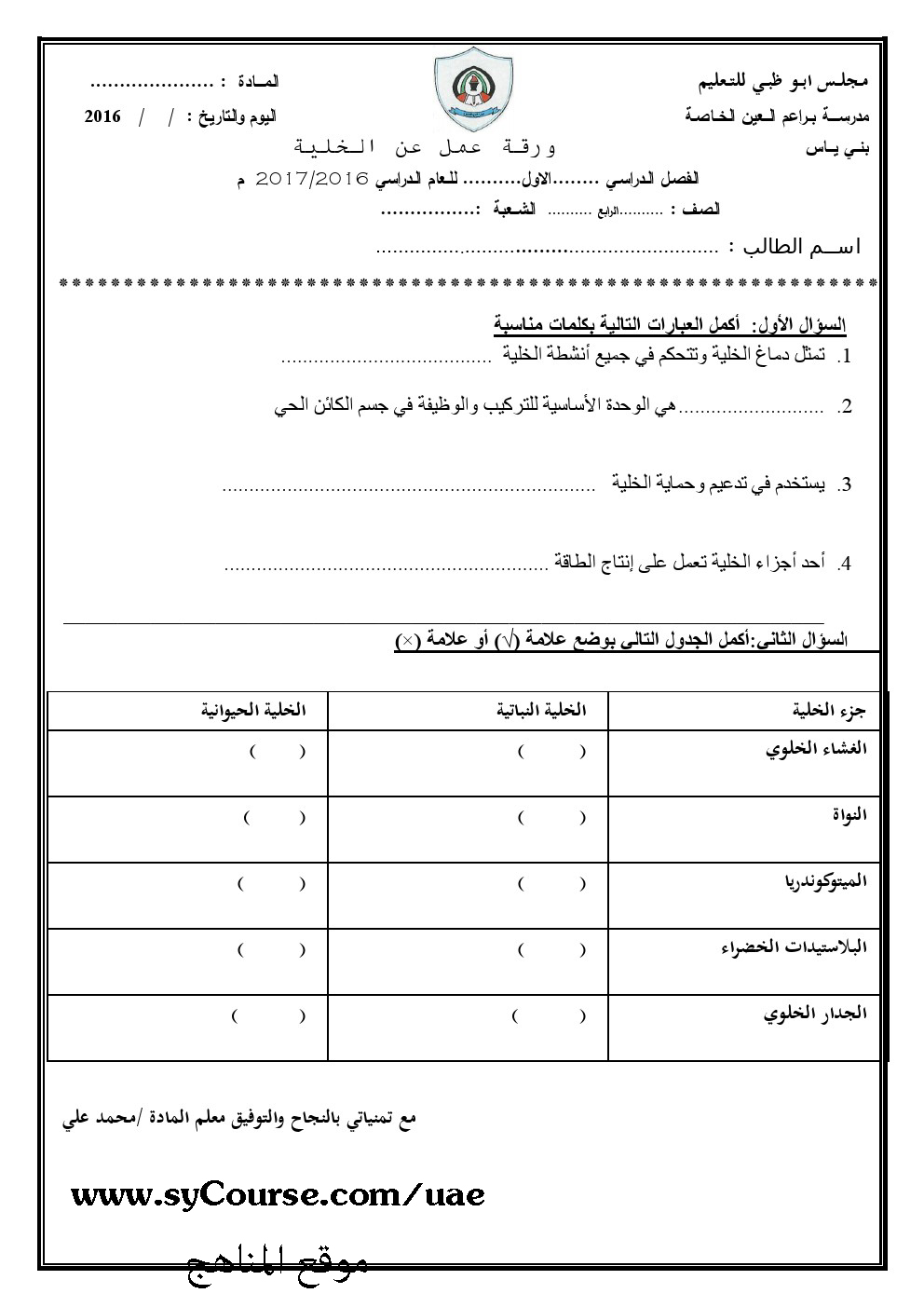 المنهاج الاماراتي: الصف الرابع, الفصل الأول, علوم, أوراق عمل حول الخلية النباتية والحيوانية |