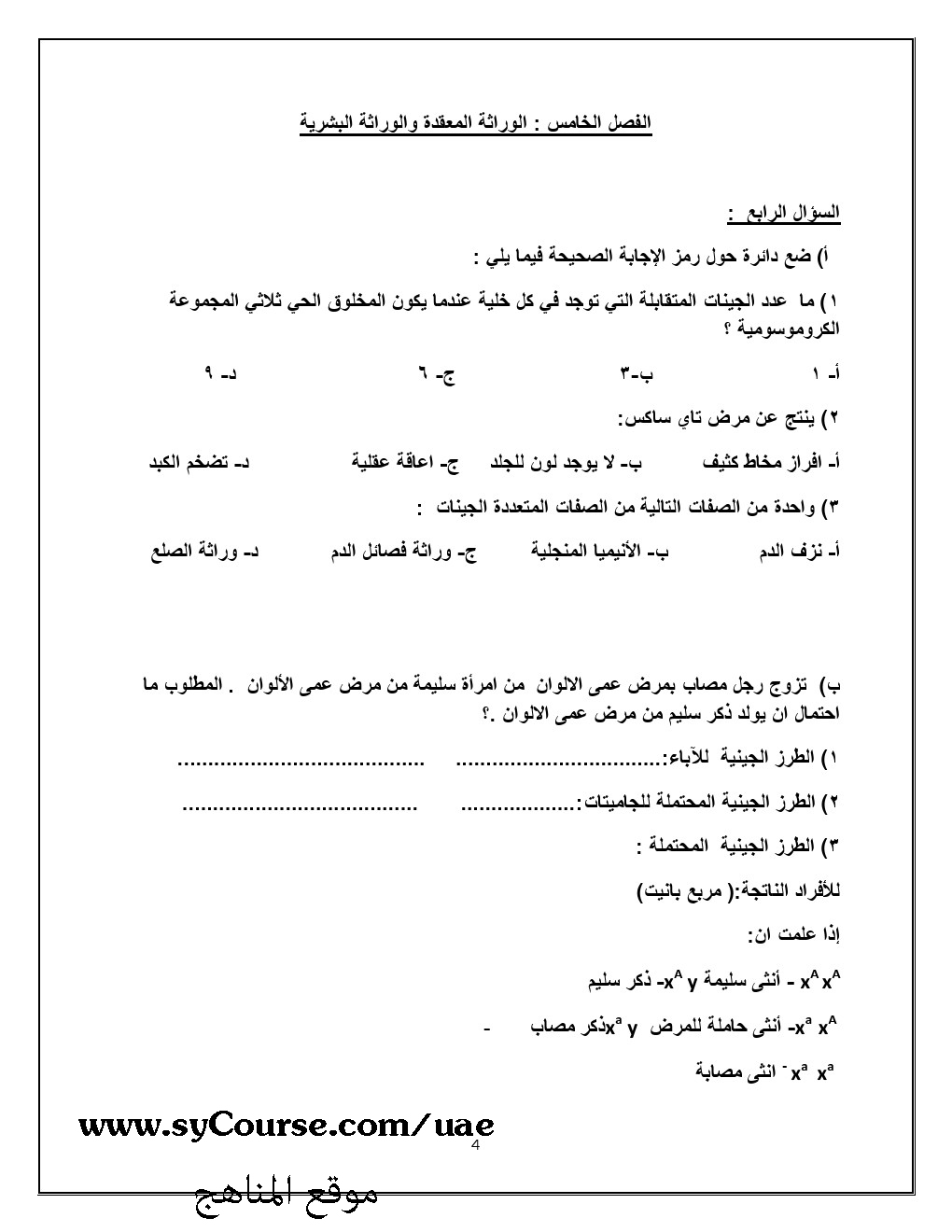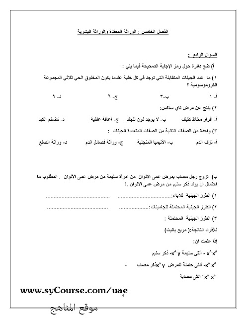 إليكم اختبار مكون من 4 صفحات في مادة العلوم للصف الثاني عشر -الفصل الخامس- الوراثة المعقدة والوراثة البشرية وفق المنهاج الاماراتي الحديث للعام الدراسي 2016-2017 | ||