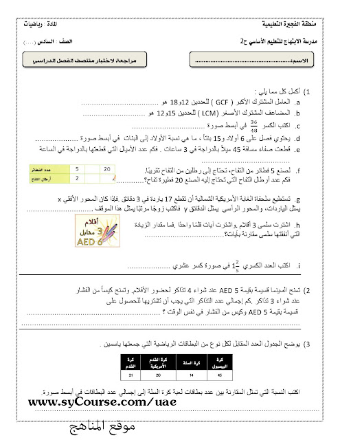 الصف السادس, الفصل الأول, رياضيات, مراجعة لاختبار منتصف الفصل الأول