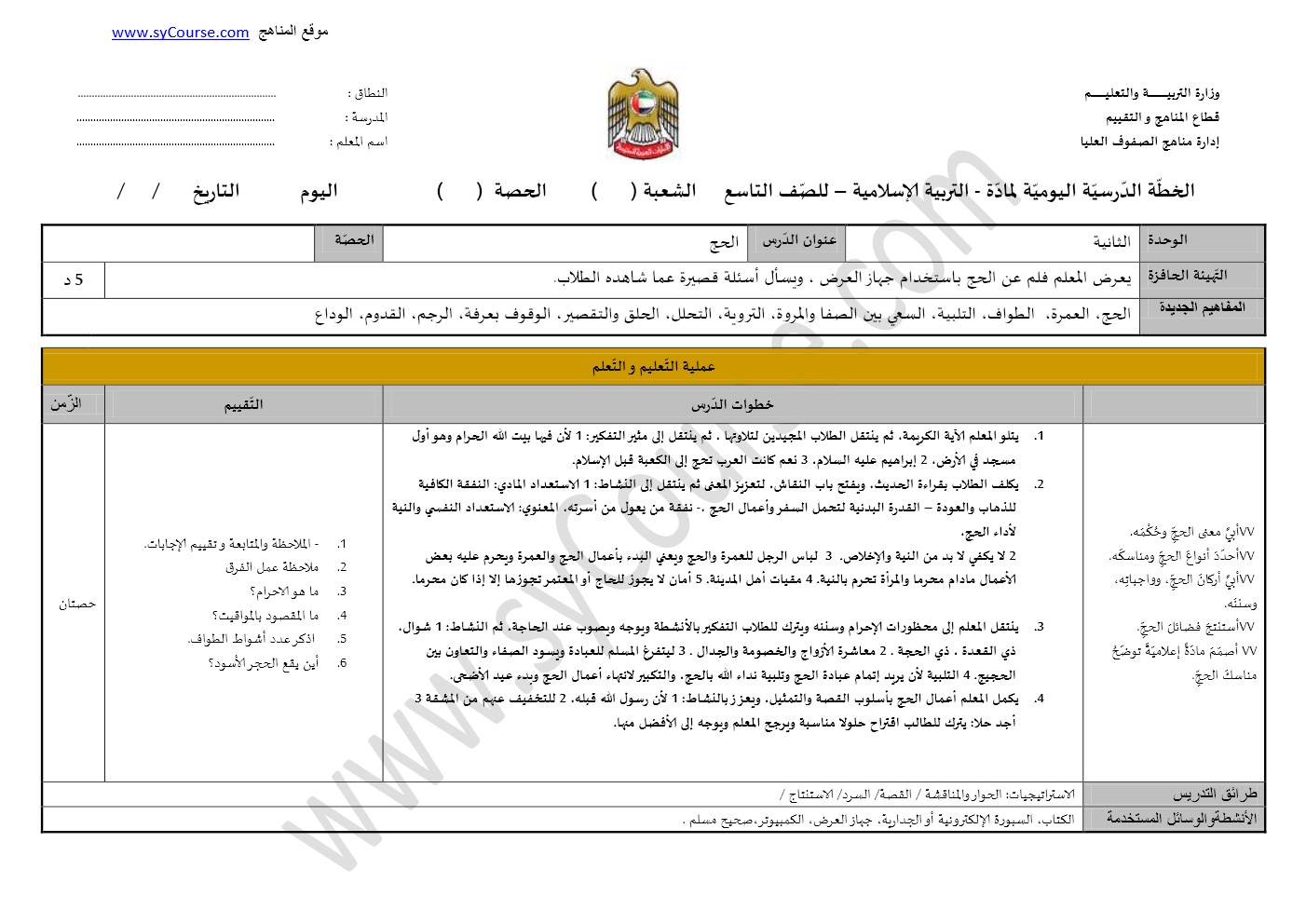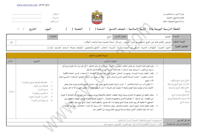 الصف التاسع, الفصل الأول, تربية اسلامية, تحضير درس الحج | ||
