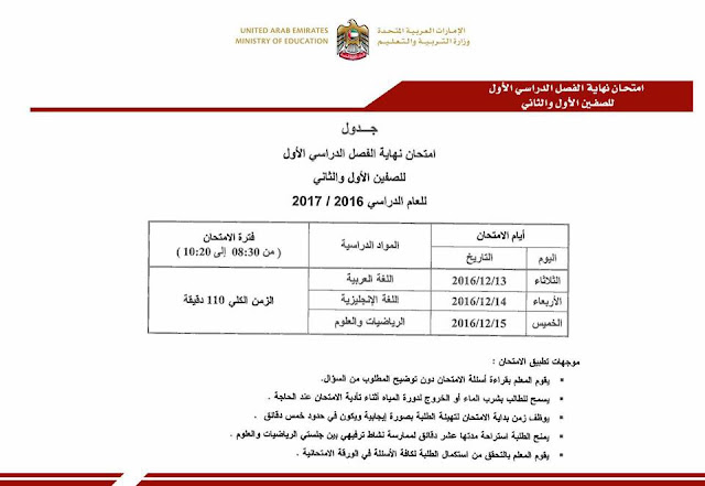 جدول امتحان نهاية الفصل الأول للصفوف من الأول حتى الثاني عشر للعام الدراسي 2016-2017 -المنهاج الاماراتي بالتوفيق لجميع طلبتنا
