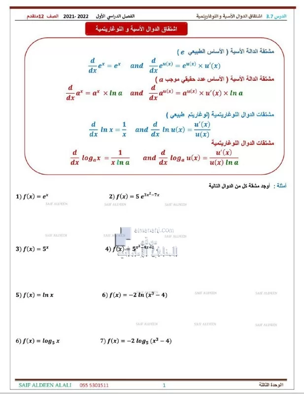 أوراق عمل درس اشتقاق الدوال الأسية واللوغاريتمية - إعداد: SAIF ALDEEN ALALI | ||