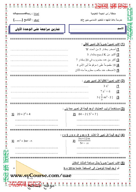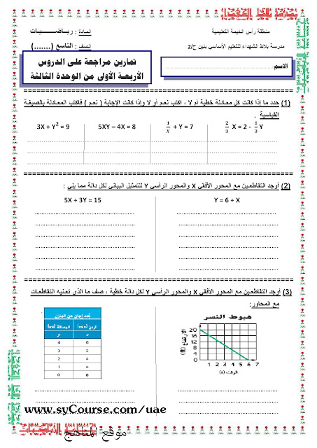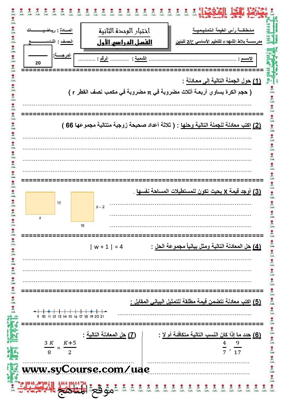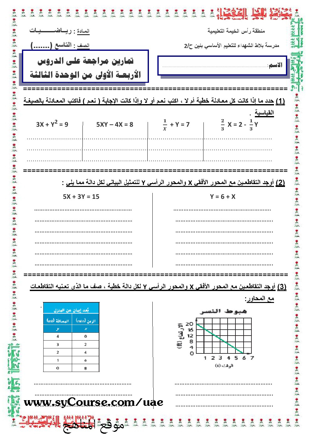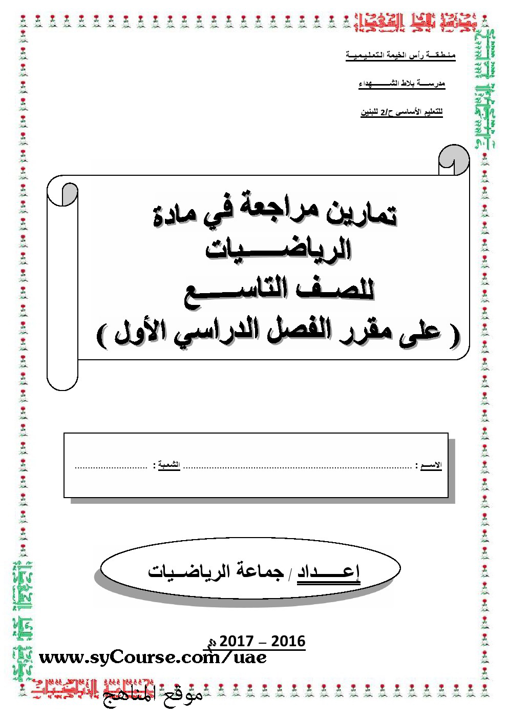 الصف التاسع, الفصل الأول, رياضيات , 2017-2018 مراجعة قبل الامتحان |
