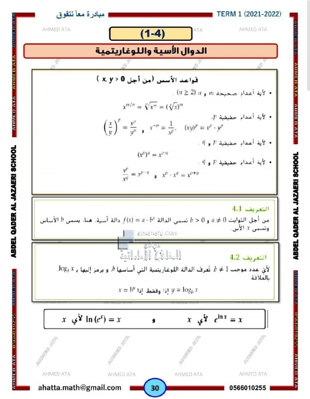 أوراق عمل الدرس الرابع الدوال الأسية واللوغاريتمية من الوحدة الأولى - إعداد: أحمد عطا | ||