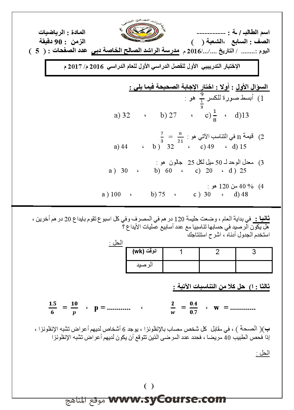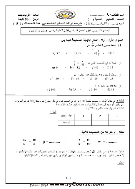 الصف السابع, الفصل الأول, رياضيات, 2017-2018نموذجتدريبي قبل الامتحان