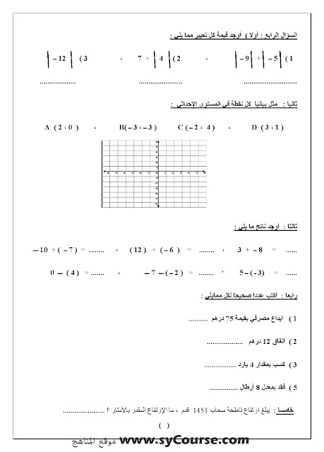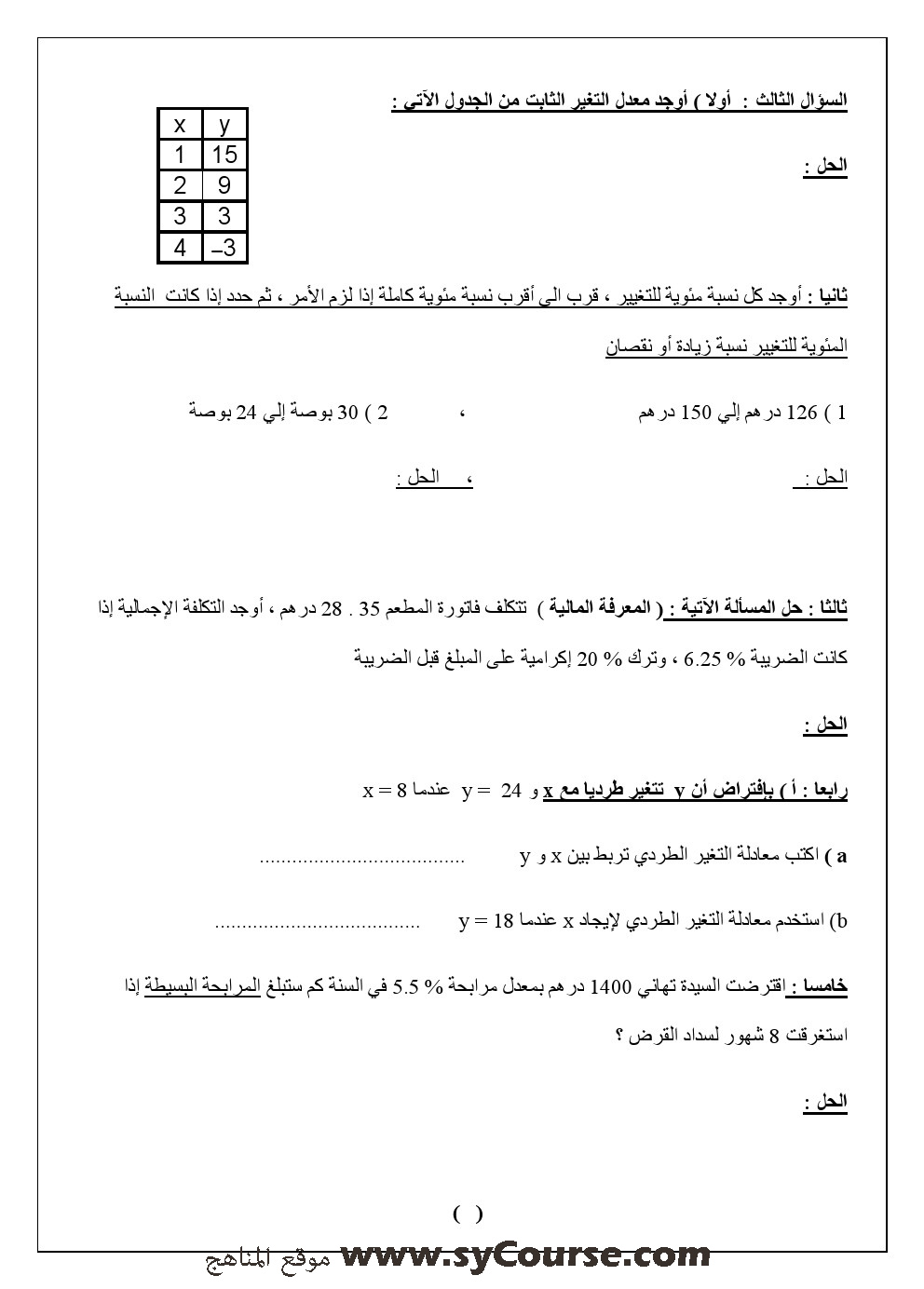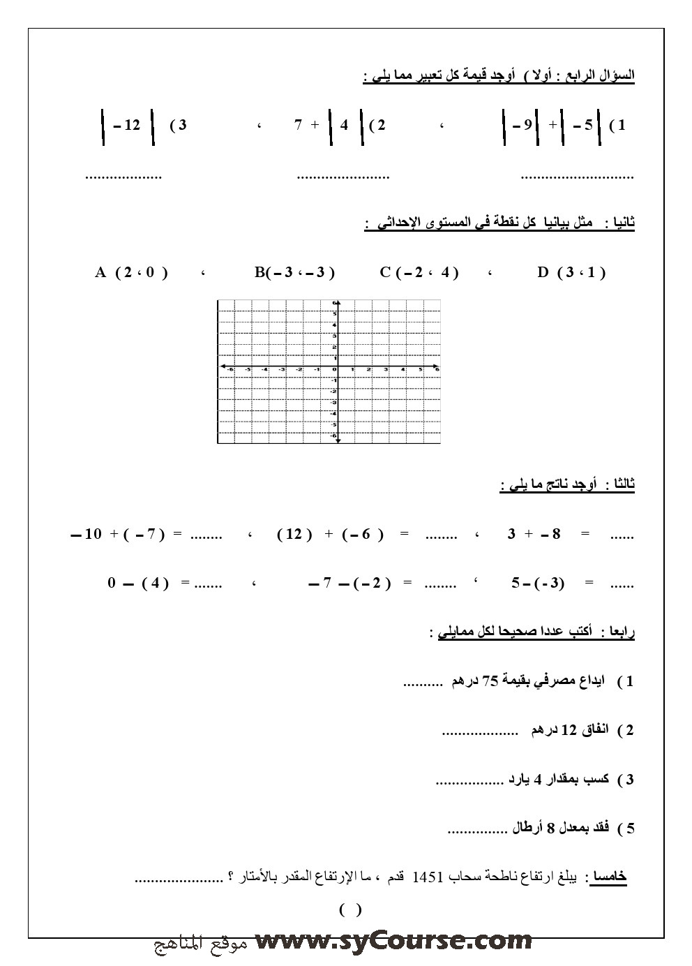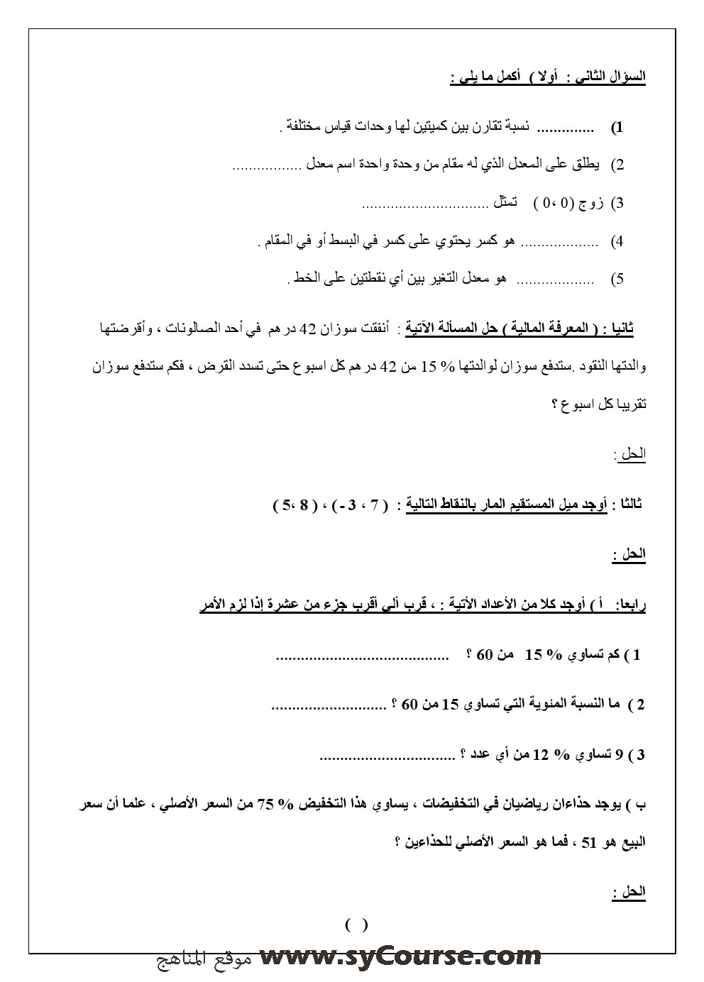 7. رياضيات, الفصل الأول, 2025-2026, أسئلة مراجعة لاختبار التقويم الثاني