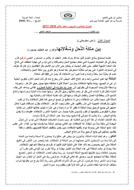 معلومات الملف: الصف العاشر, الفصل الأول, لغة عربية,نموذجامتحاني تدريبي 2016-2017 | ||