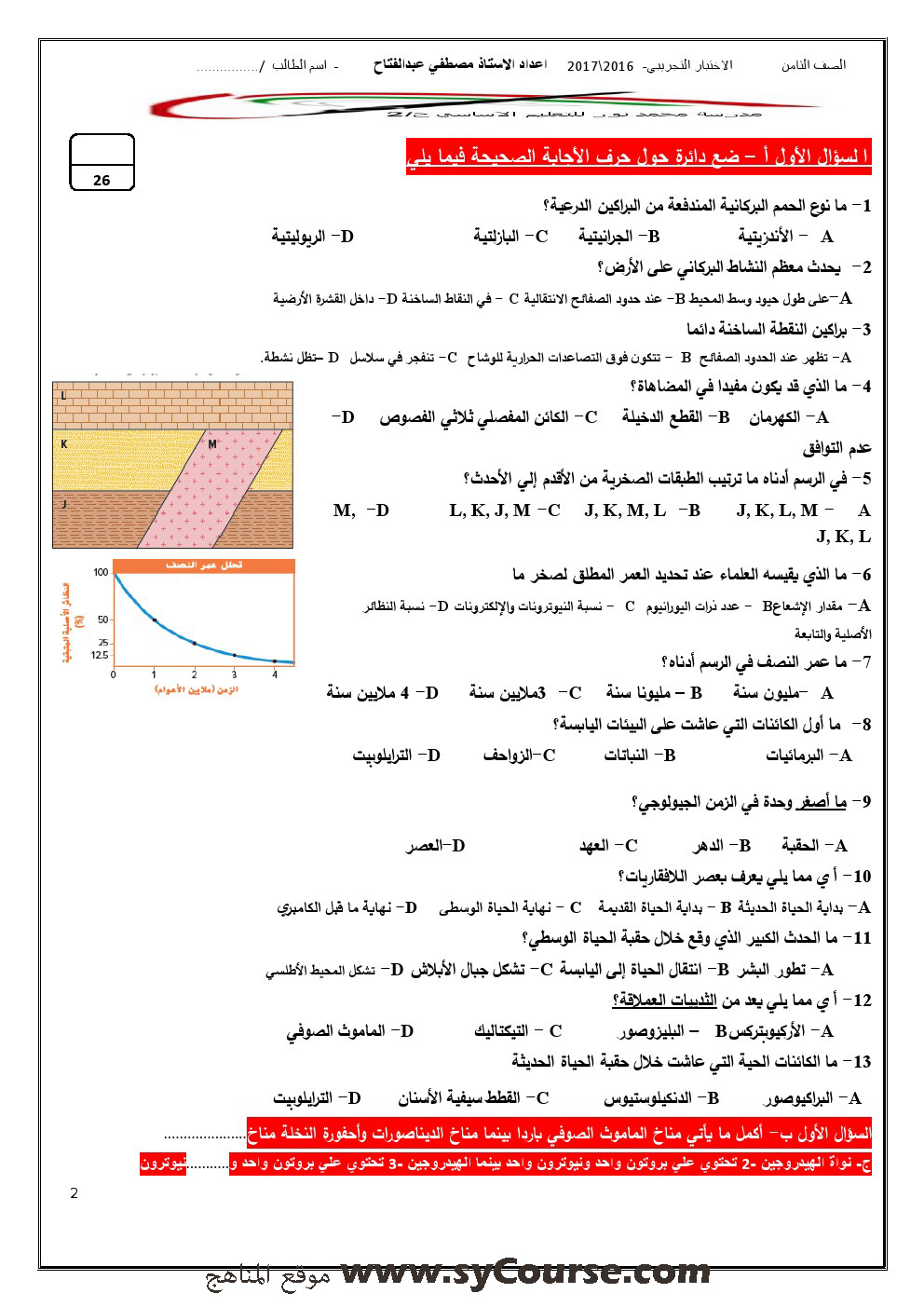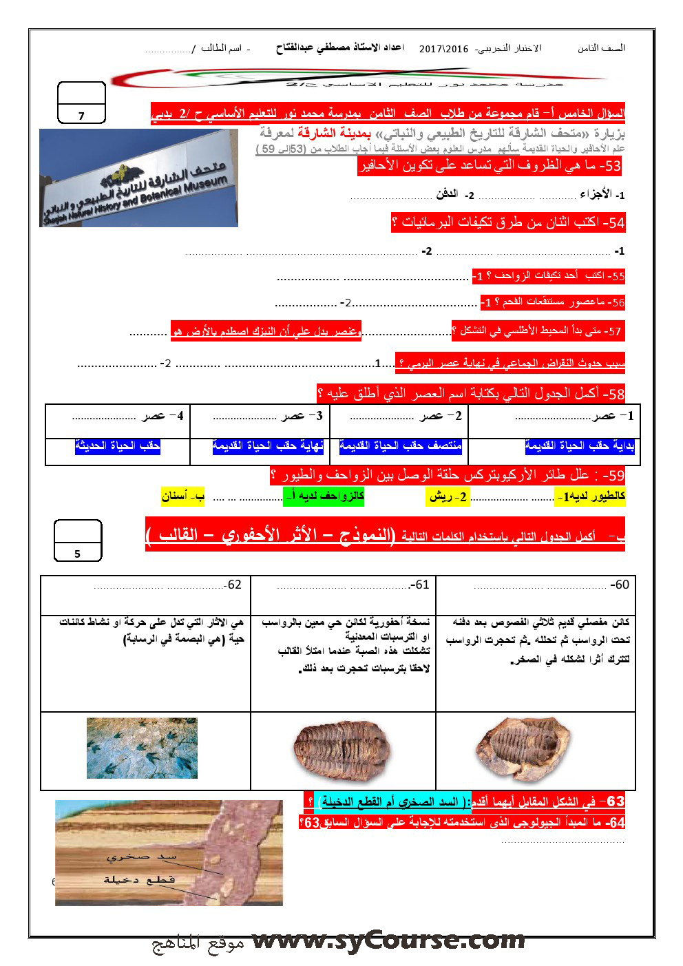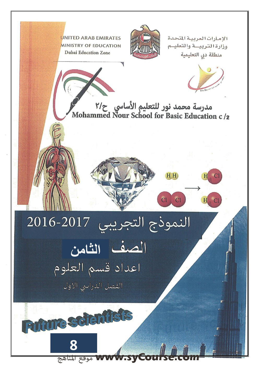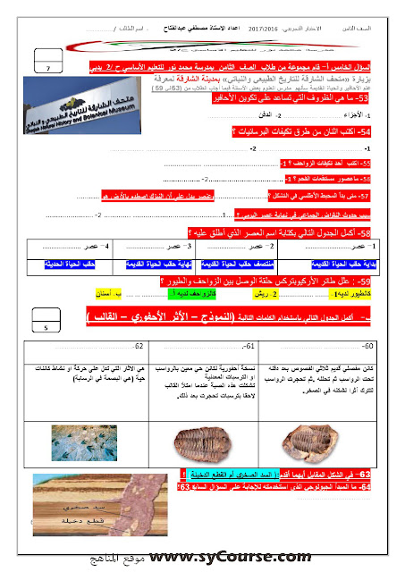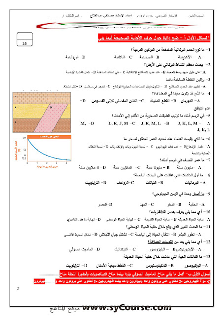 معلومات الملف: الصف الثامن, الفصل الأول, علوم,نموذجتدريبي على الامتحان النهائي 2016-2017 | ||