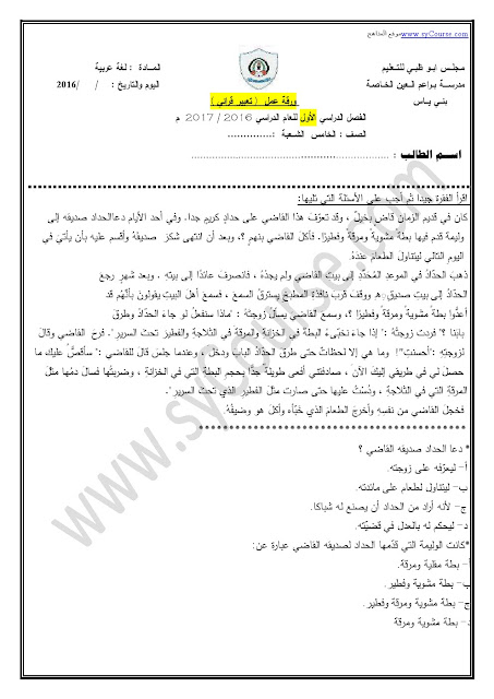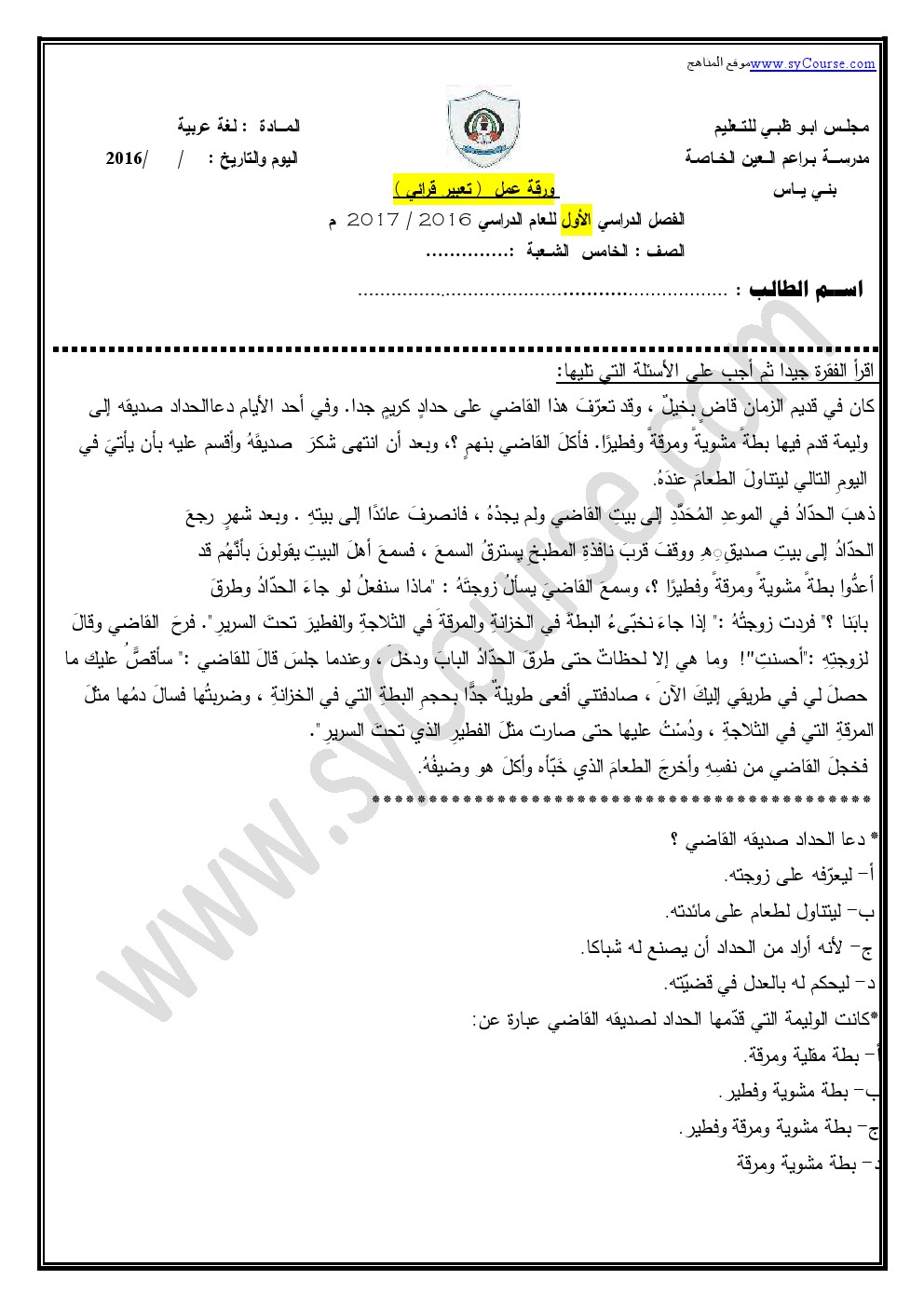 معلومات الملف: الصف الخامس, الفصل الأول, لغة عربية,نموذجامتحاني تدريبي 2016-2017 | ||