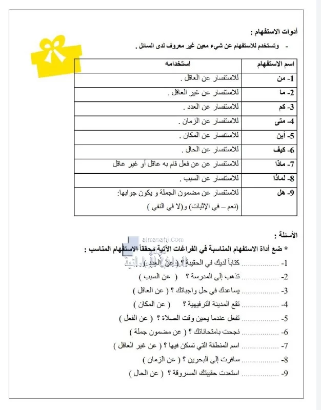 تم إيجاد الملف: ورقة عمل درس أدوات الاستفهام