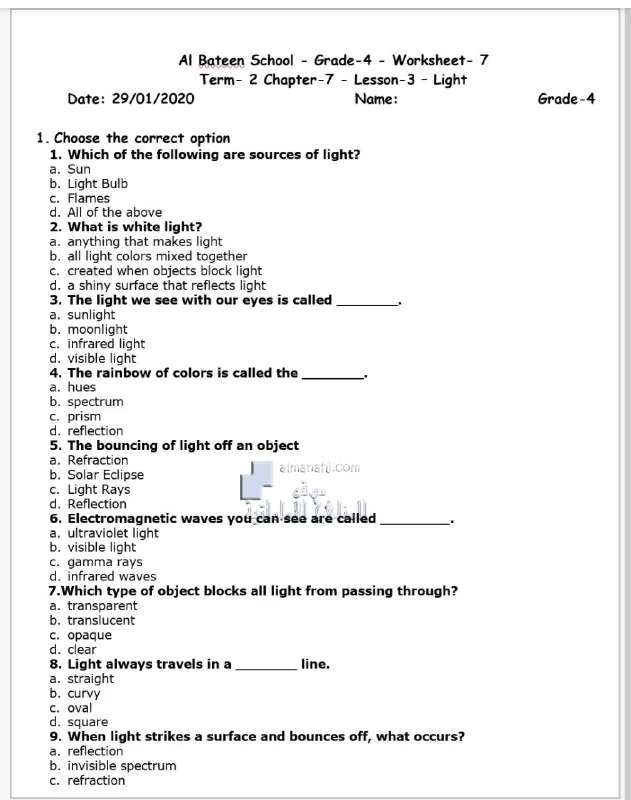 تم إيجاد الملف: أوراق عمل درس الضوء Light