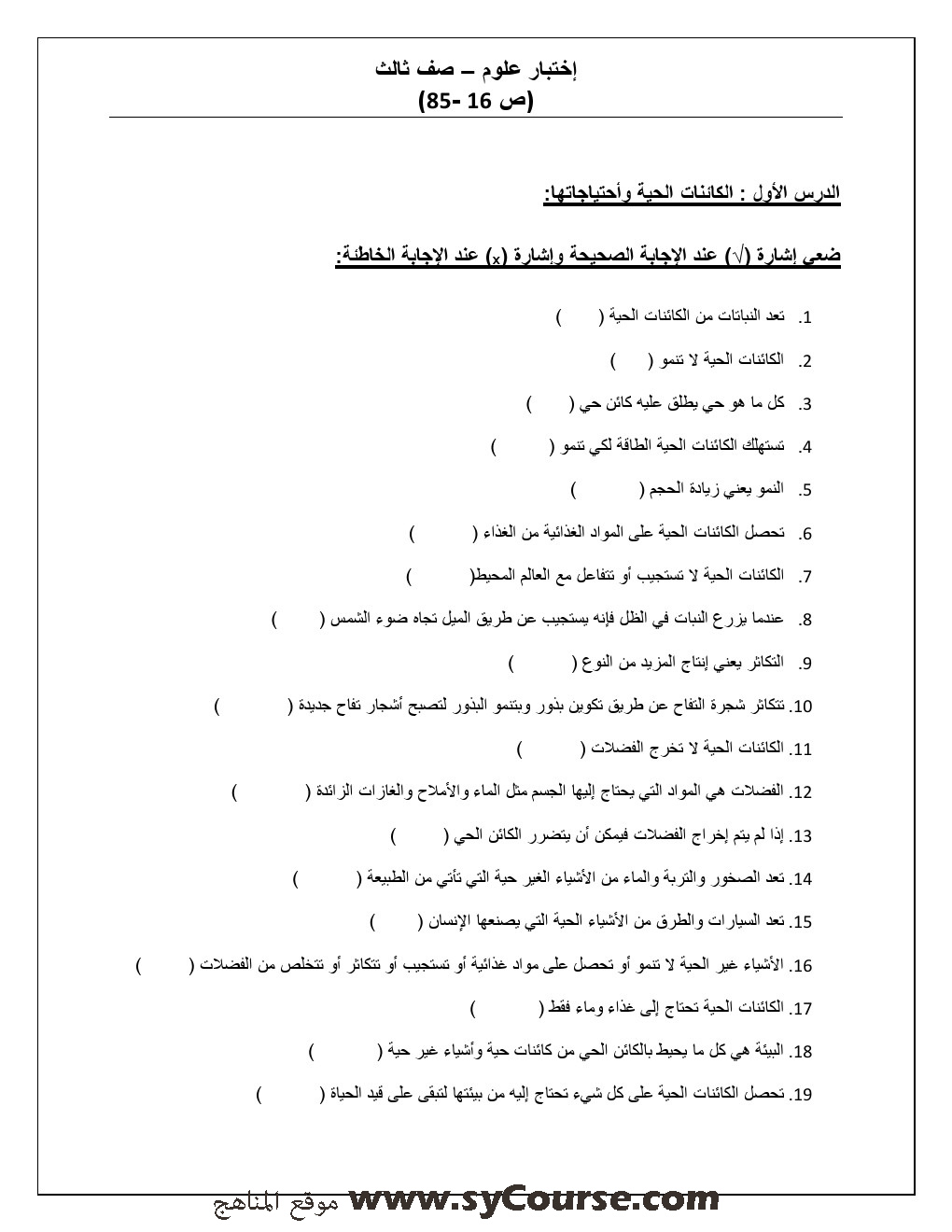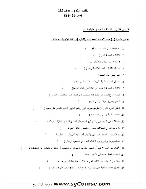 الصف الثالث, الفصل الأول, علوم, نماذج امتحانية تدريبية 2016-2017