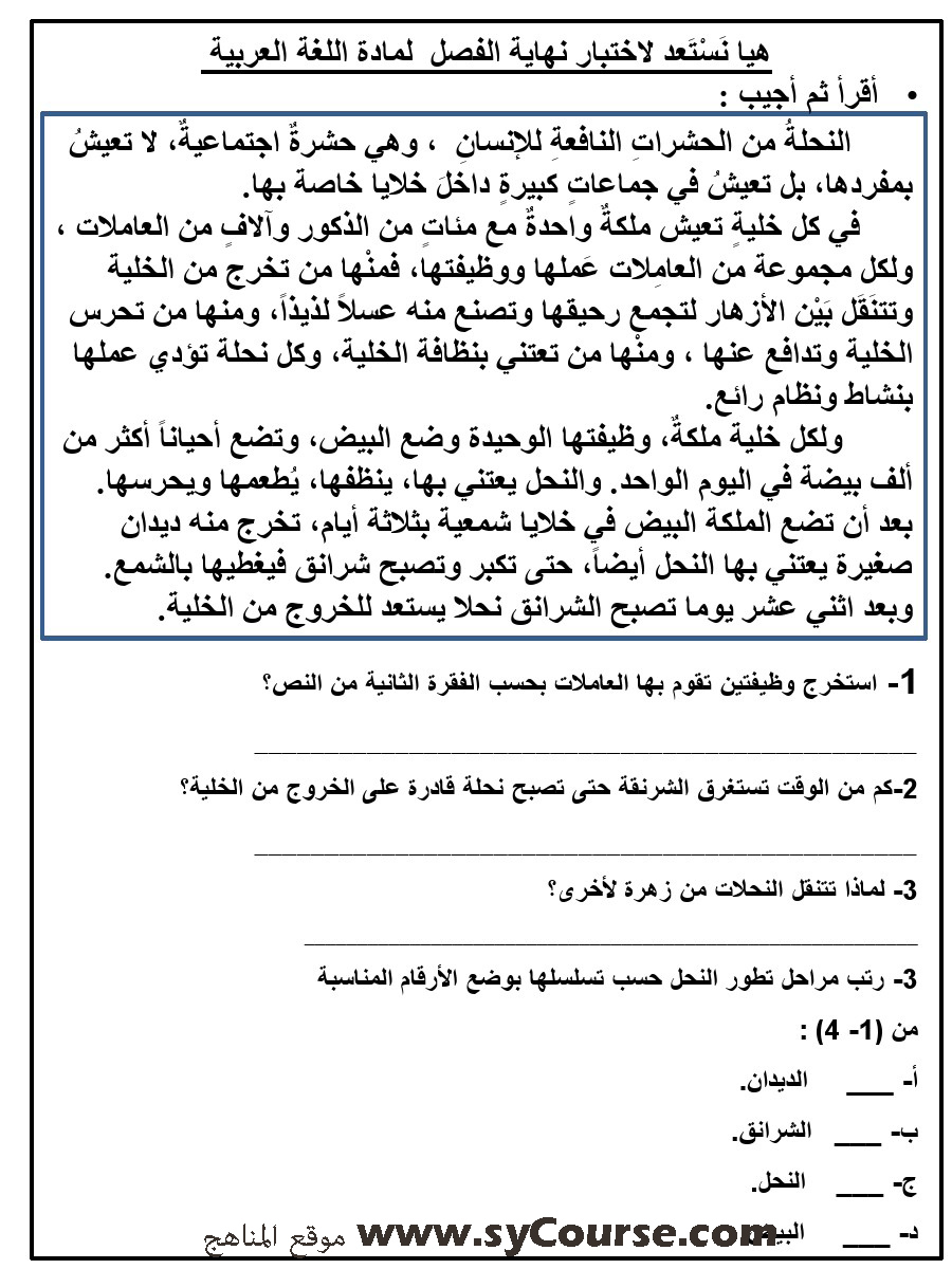 يقدم إليكم موقع المناهج نماذج امتحان في اللغة العربية للصف الخامس:
