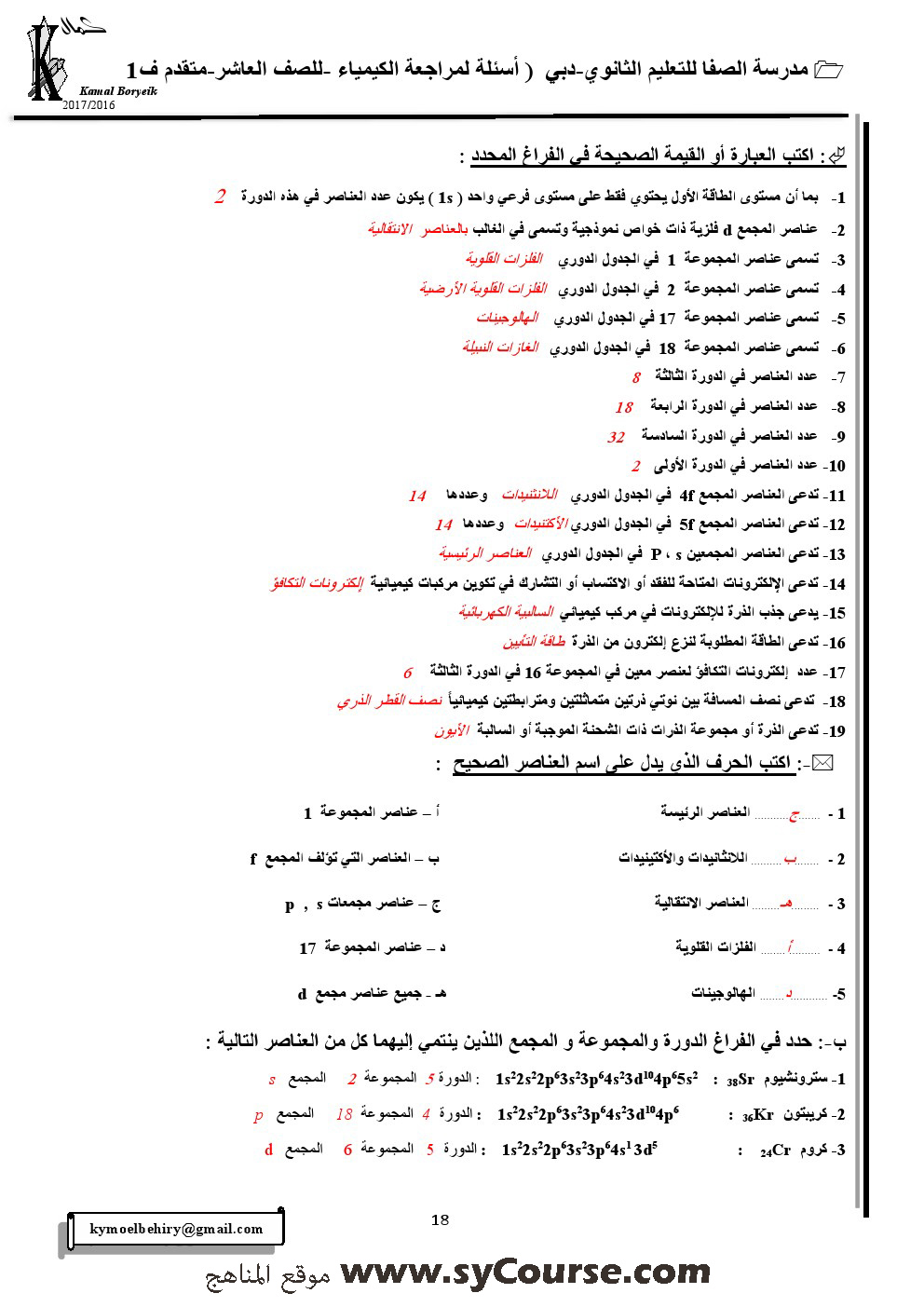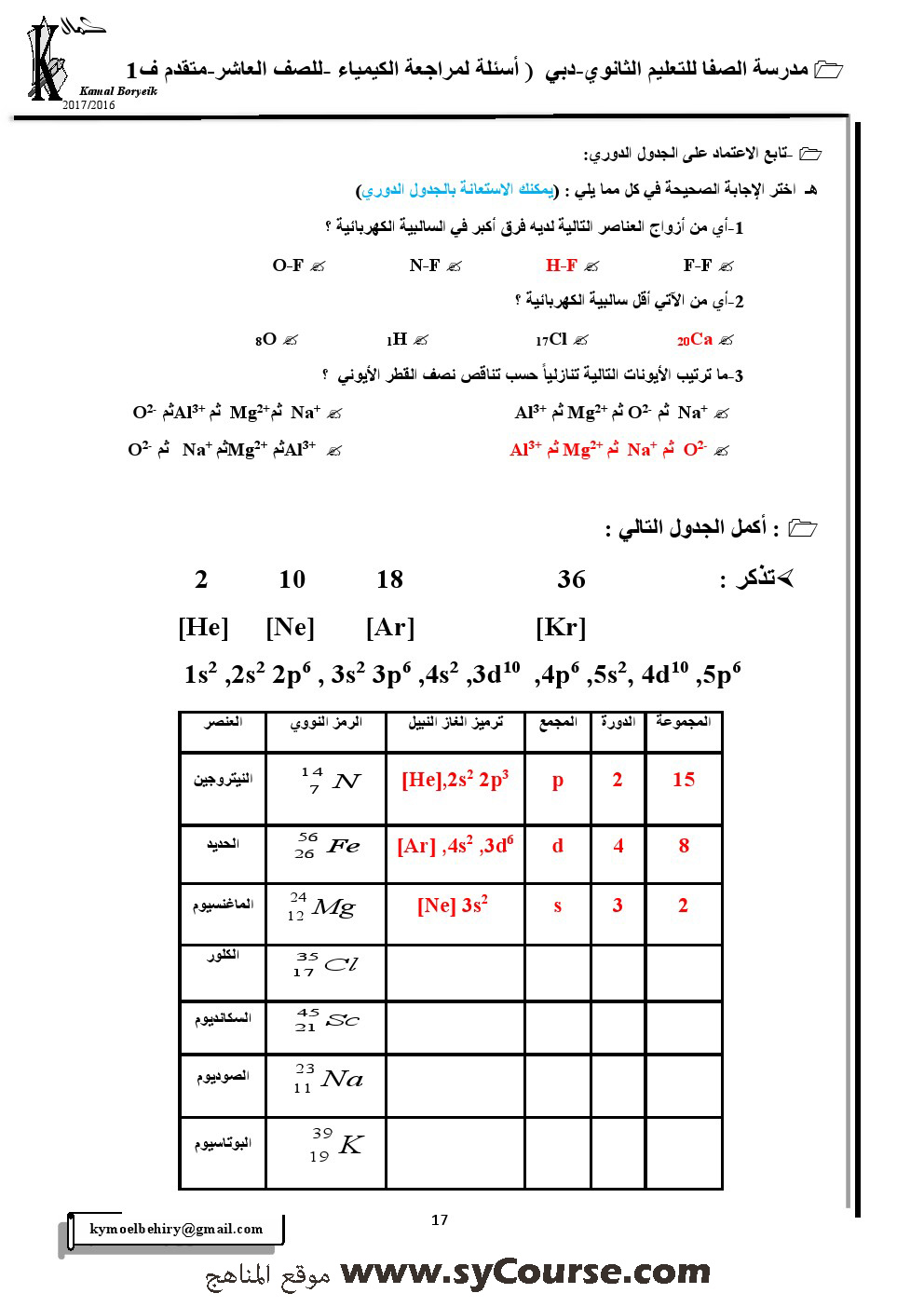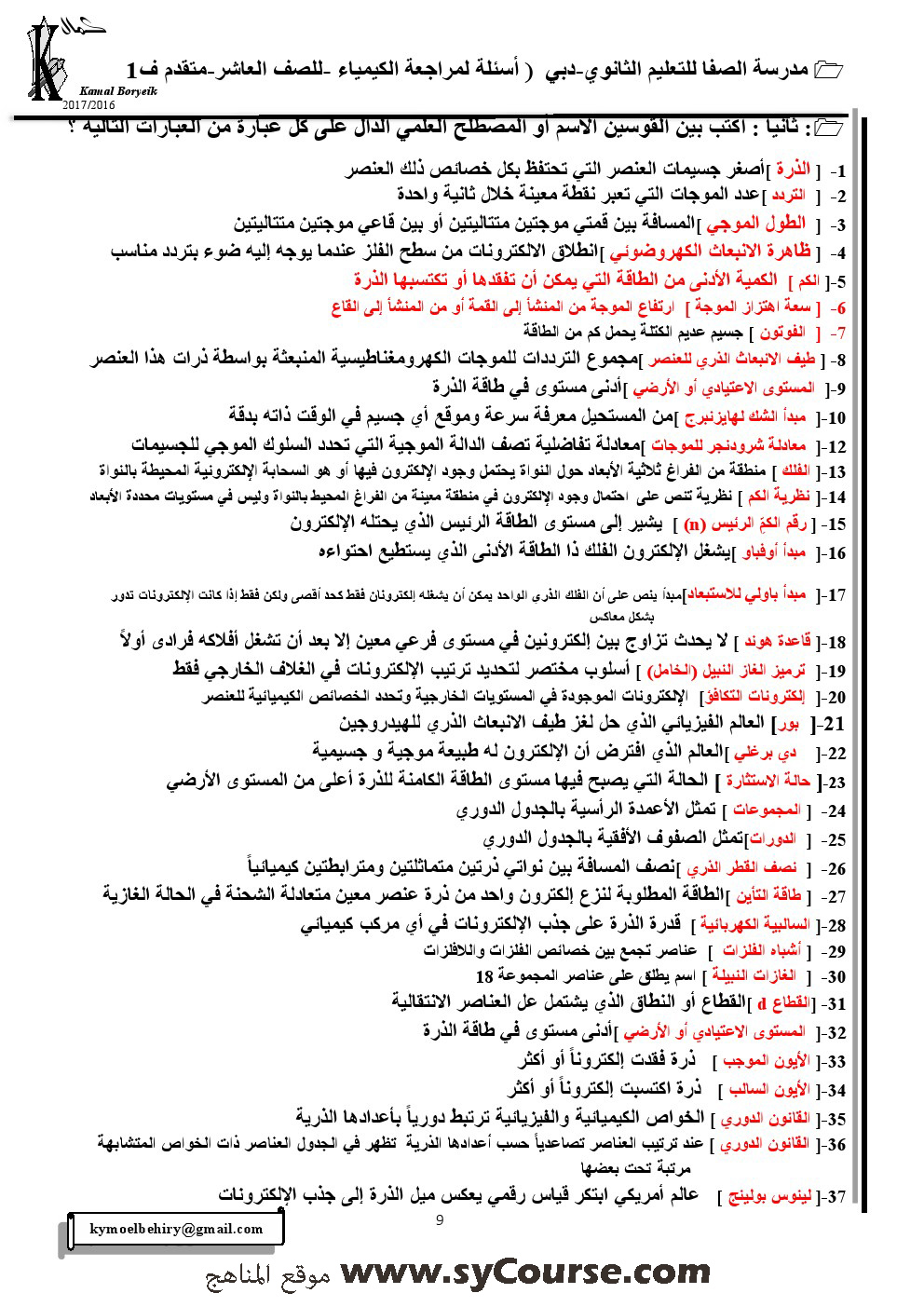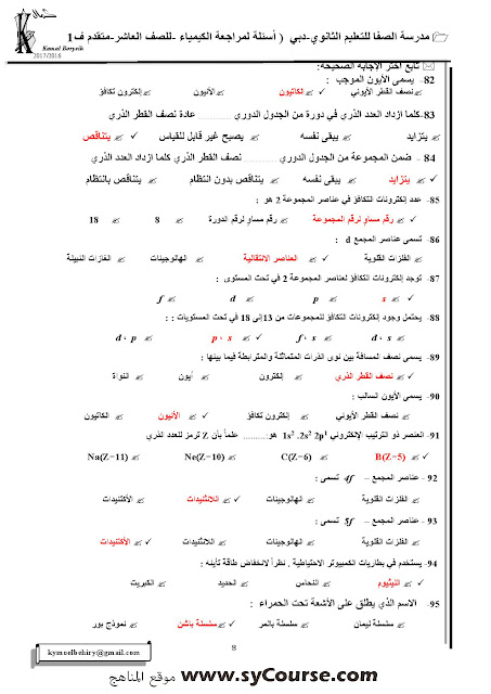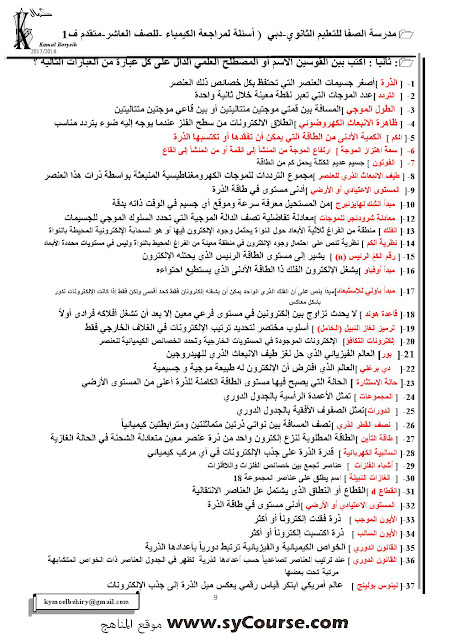 إليكم مراجعة في الكيمياء مع الاجوبة للصف العاشر وفق المنهاج الاماراتي الحديث للعام الدراسي 2016-2017 وهذه المراجعة مكونة من 20 صفحة: بالتوفيق لجميع الطلبة: