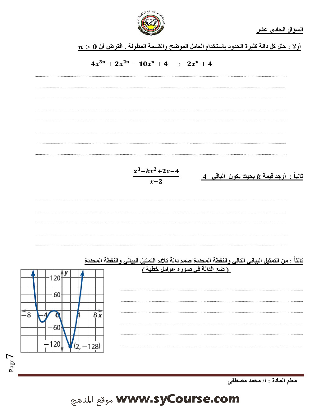 | نموذج تدريبي على امتحان نهاية الفصل الأول من | ||