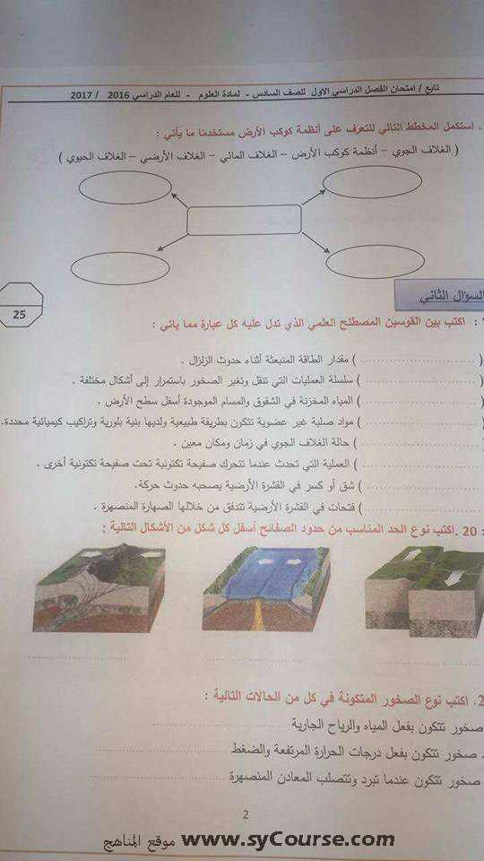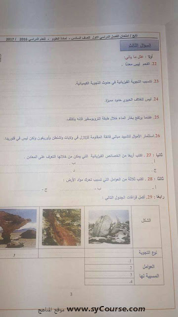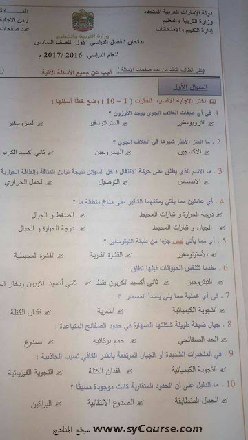 الصف السادس, الفصل الأول, علوم, أسئلة الوزارة لامتحان نهاية الفصل الأول من العام الدراسي 2016-2017