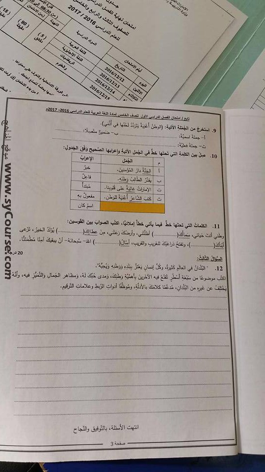 معلومات الملف: الصف الخامس, الفصل الأول, لغة عربية, أسئلة الوزارة لامتحان نهاية الفصل الأول من العام الدراسي 2016-2017 | ||