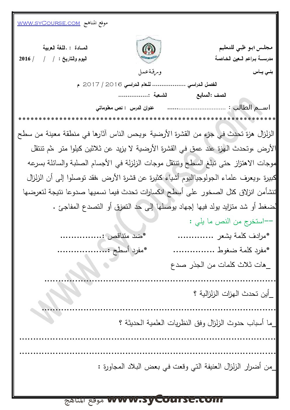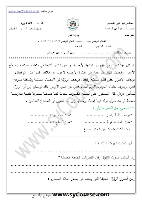 معلومات الملف: الصف السابع, الفصل الأول, لغة عربية,نموذجامتحان تدريبي لنهاية الفصل الأول من العام الدراسي 2016-2017 | ||