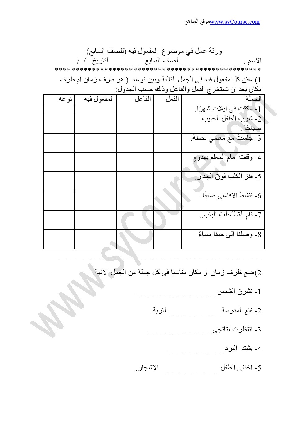 | ورقة عمل حول المفعول فيه | ||