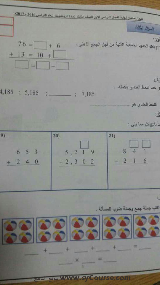 معلومات الملف: الصف الثالث, الفصل الأول, رياضيات, أسئلة الامتحان الوزاري لامتحان نهاية الفصل الأول من العام الدراسي 2016-2017 | ||