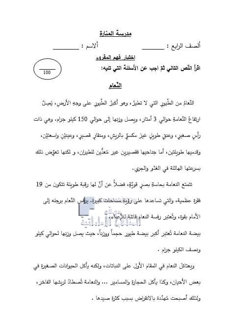 تم إيجاد الملف: اختبار فهم المقروء نص النعام